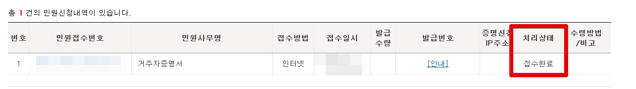처음 신청하면 이렇게 처리상태에 [접수완료]라고 나옵니다. 접수 처리가 될 때 까지 기다려주어야하는데 몇 시간 안에 처리가 되었습니다.
