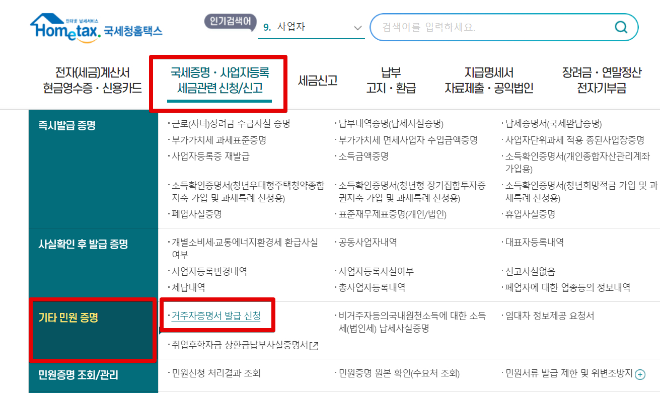 홈택스 첫 화면에서 상단 메뉴에서 [국세증명 사업자등록 세금관련 신청/신고]로 들어간 다음 [기타 민원 증명]으로 들어가고 [거주자증명서 발급 신청]으로 들어갑니다.