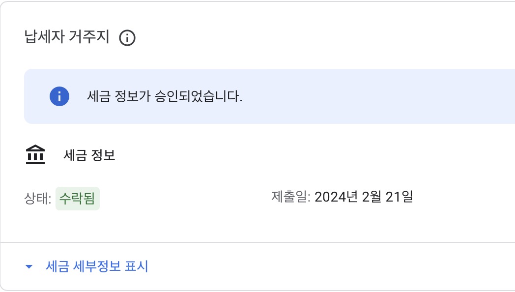 구글 애드센스 페이지에서도 납세자 거주지가 수락됨으로 표시되어 구글 애드센스 싱가포르 부분은 클리어되었습니다.