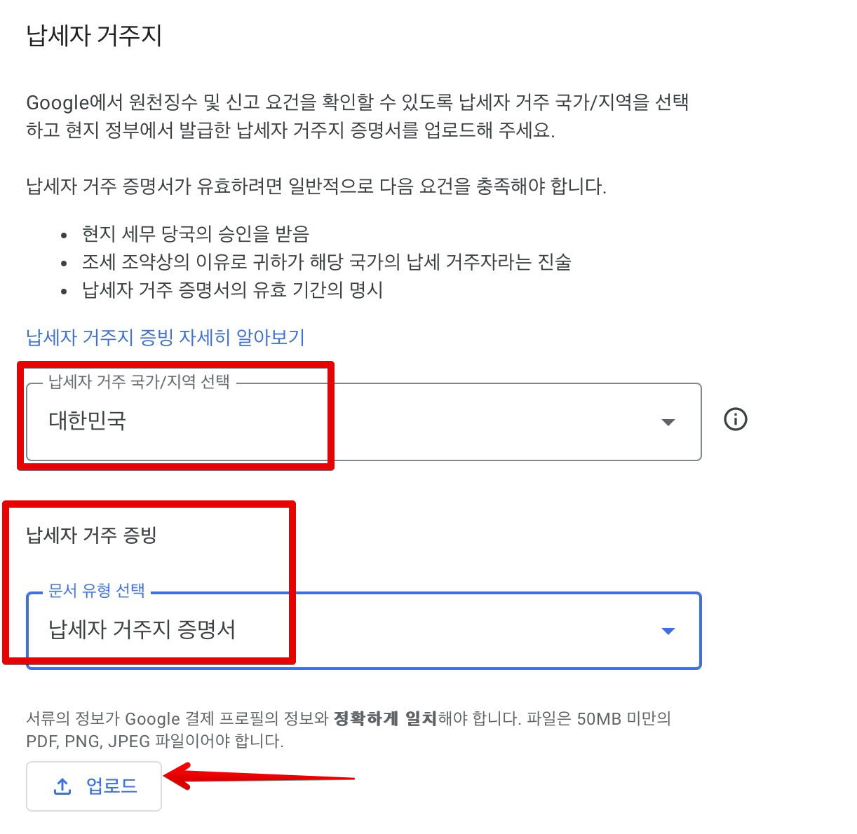 납세자 거주 국가에는 대한민국 선택하고 문서 유형 선택에는 납세자 거주지 증명서를 선택합니다. 그리고 아래쪽에 업로드 버튼 클릭합니다.