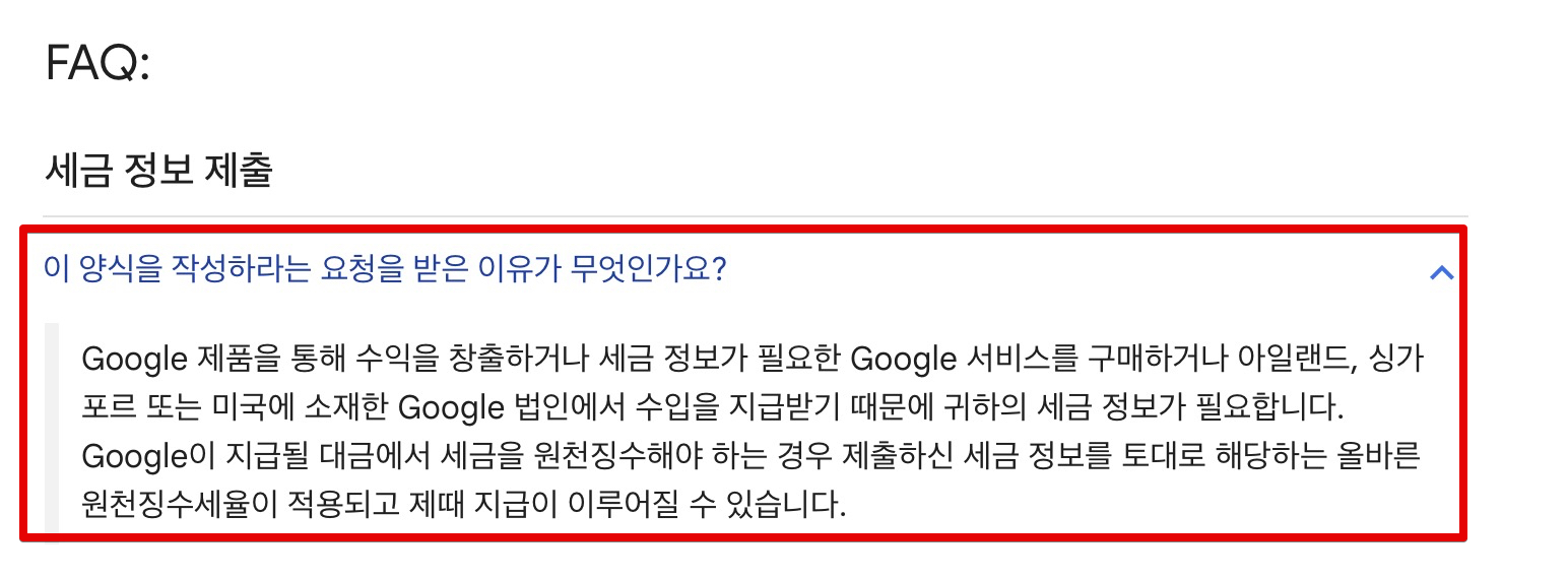 FAQ에서 세금 정보 제출에 대한 몇 가지 사항들의 안내가 있었는데, 일부 중요해보이는 것만 살펴봤습니다. 일단 구글 애드센스를 지급받는 입장에서는 싱가포르 등 구글 법인에서 수입을 지급받기 때문에 세금 정보가 필요하다고 합니다.