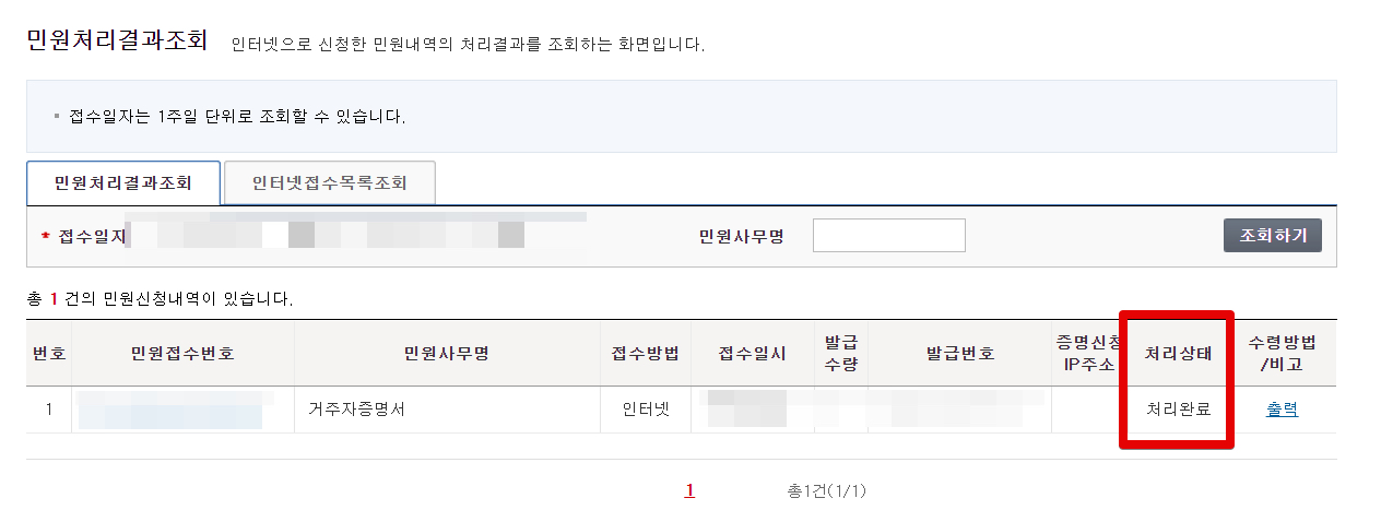 민원처리가 완료되었다는 연락을 받고 들어가보니 [처리완료]가 되어 출력이 가능했습니다.
