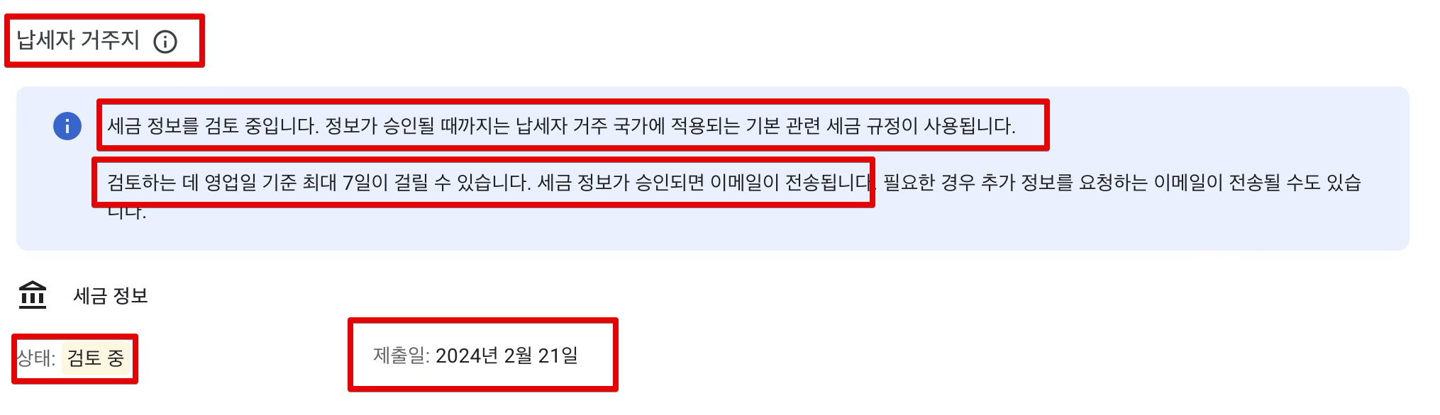 하지만 페이지를 잘 살펴보니 여기에서 끝이 아니고 납세자 거주지 항목에서 세금 정보가 아직 검토 중이었고요. 정보가 검토 및 승인이 될 때 까지 최대 영업일 7일 정도 걸릴 수 있다고 합니다. 여기까지 통과를 해야 완료 되는 것 같아서 일단은 납세자 거주지 등록까지 기다리는 중입니다. 제출일은 한국 날짜 기준으로는 2월 22일인데 구글 애드센스 페이지에는 2월 21일로 나오고 있습니다.