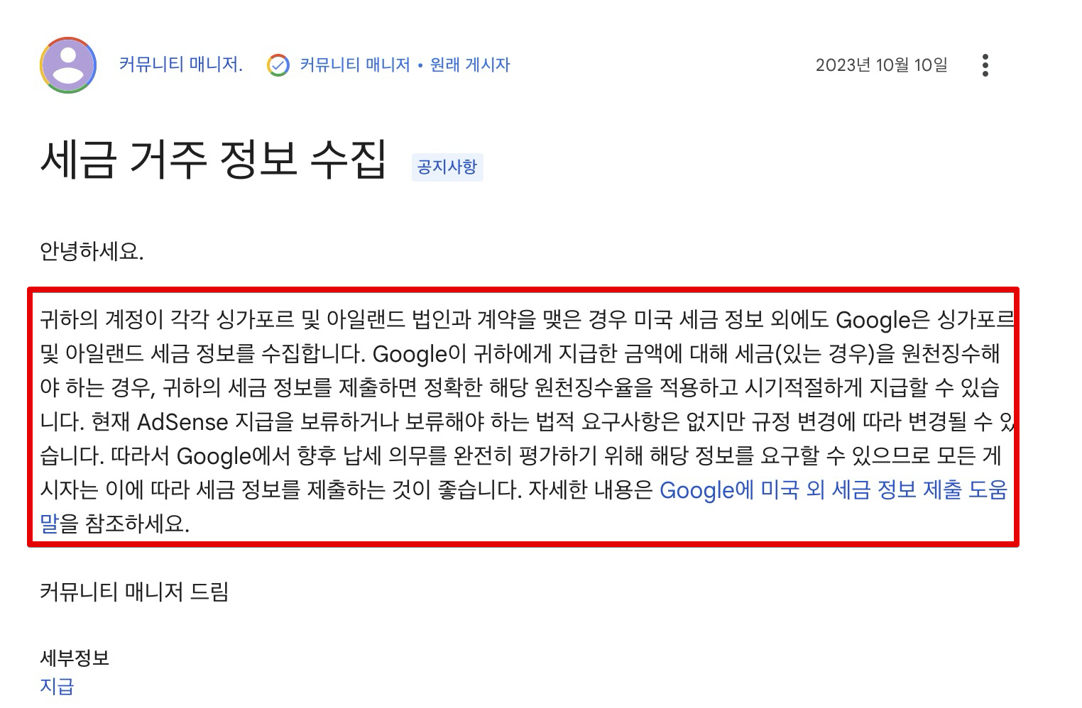 좀 더 궁금해서 구글 애드센스 커뮤니티에서 2023년 10월에 올라온 커뮤니티 글을 살펴보았습니다. 마찬가지로 원천징수율 적용 및 세금 정보를 등록하라는 이야기입니다.