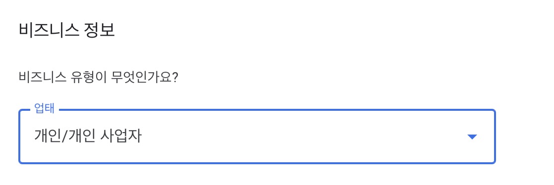 비즈니스 정보에는 개인/개인 사업자를 선택합니다.