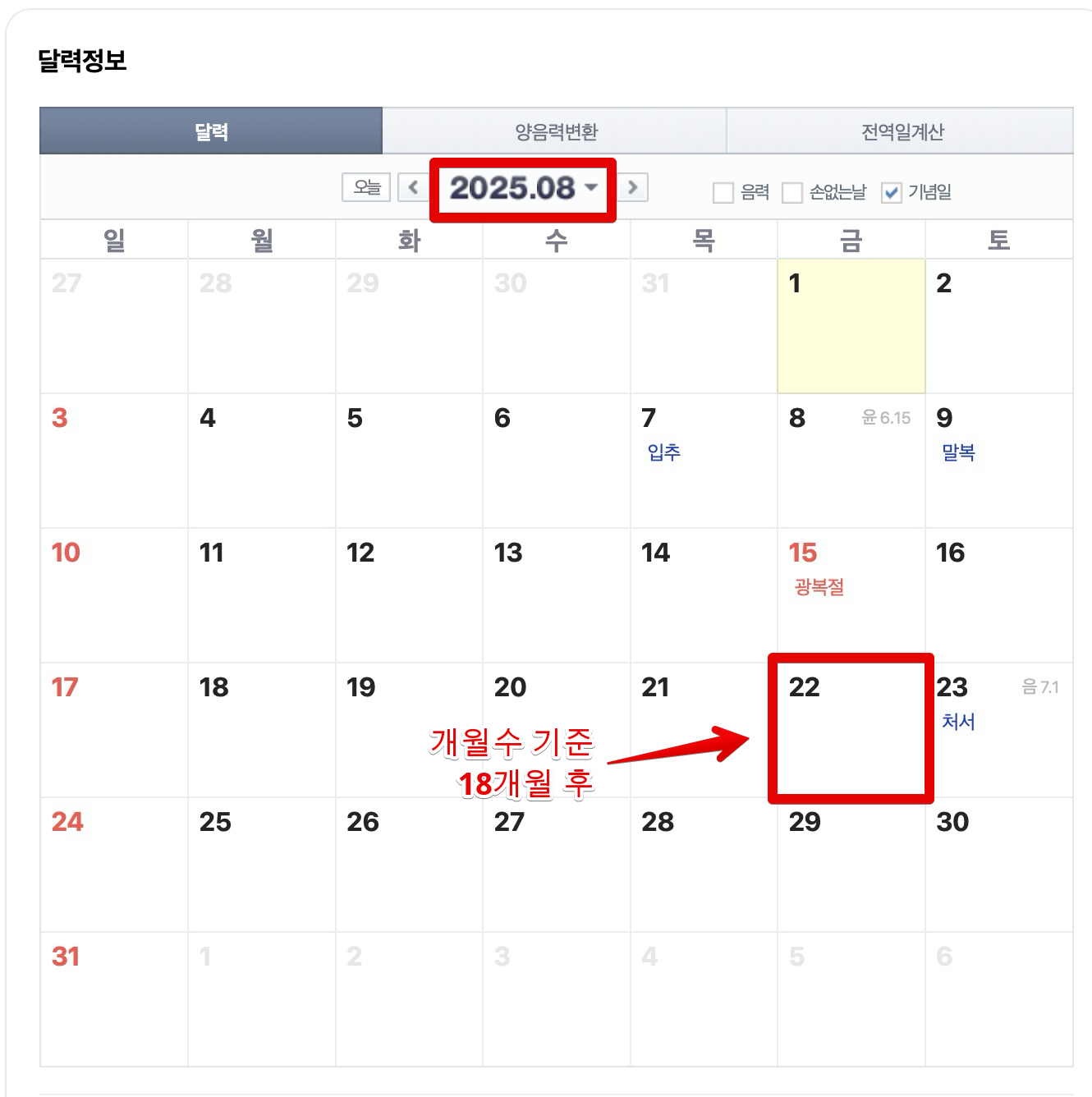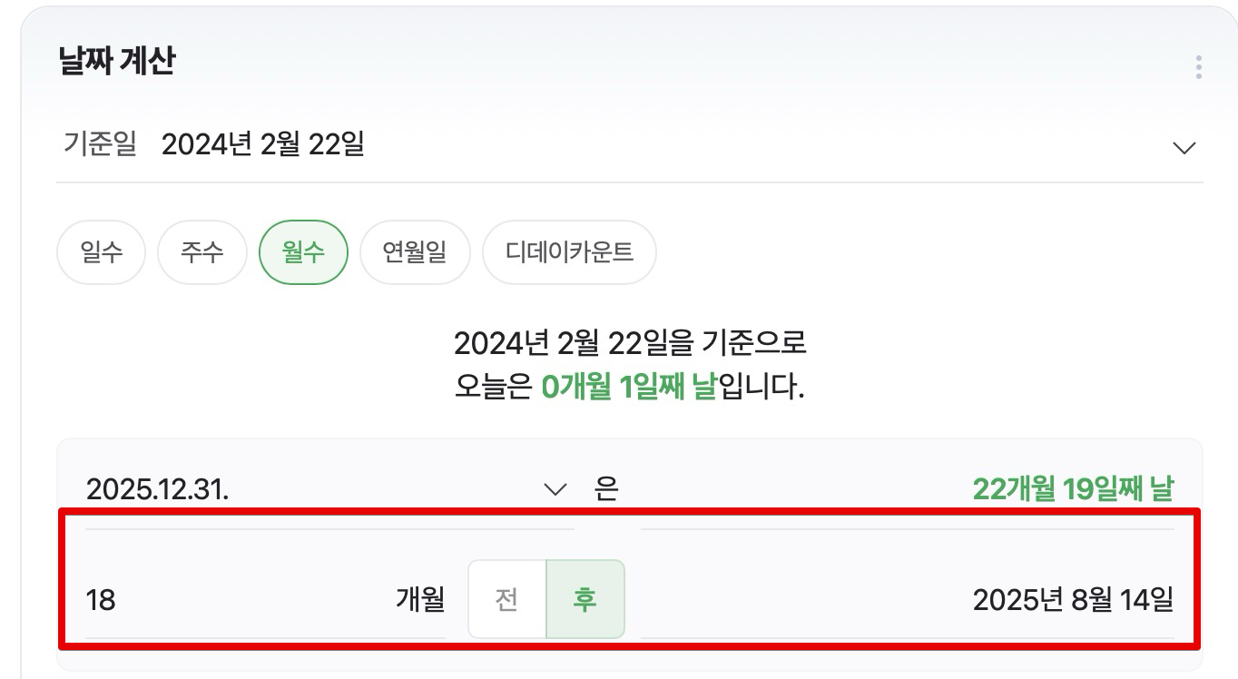 알고봤더니 네이버 날짜계산기의 경우, 월수 계산일 경우에는 30일을 1개월로 계산을 하고 있어서 12개월이 365일이 아니라 360일이 되어버리게 됩니다. 따라서 네이버 날짜계산기로는 18개월 이후 날짜를 정확하게 계산이 안되고요.