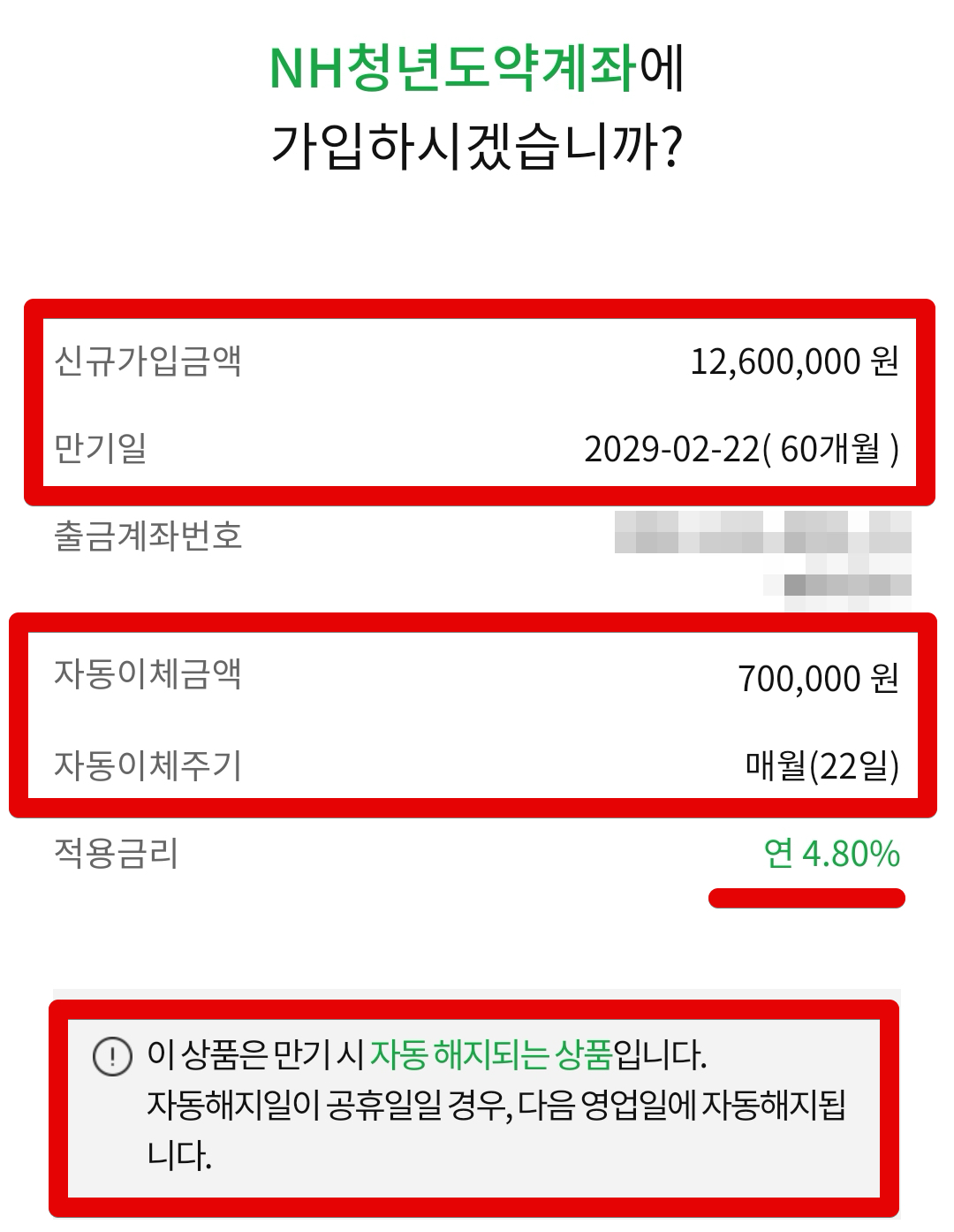 이렇게해서 자동이체 신청을 2025년 8월 22일로 설정했습니다. 그런데 여기에서 개인적으로 한가지 궁금했었던점은, 자유적금 상품의 경우 이자를 일할로 계산하기 때문에 일반적으로 가장 좋은 적금 가입 전략은 자동이체를 매월 1일로 설정하는 것인데요. 청년도약계좌의 경우, 2월 22일에 가입이 되어서 하루라도 예치를 하려면 애매하게 22일로 결제를 해야하는 부분이 있어서... 이 부분은 나중에 NH농협측에 전화나 채팅 상담으로 문의를 해보고 최대치의 이자를 낼 수 있는 방법이 있는지 좀 더 찾아볼 생각입니다.