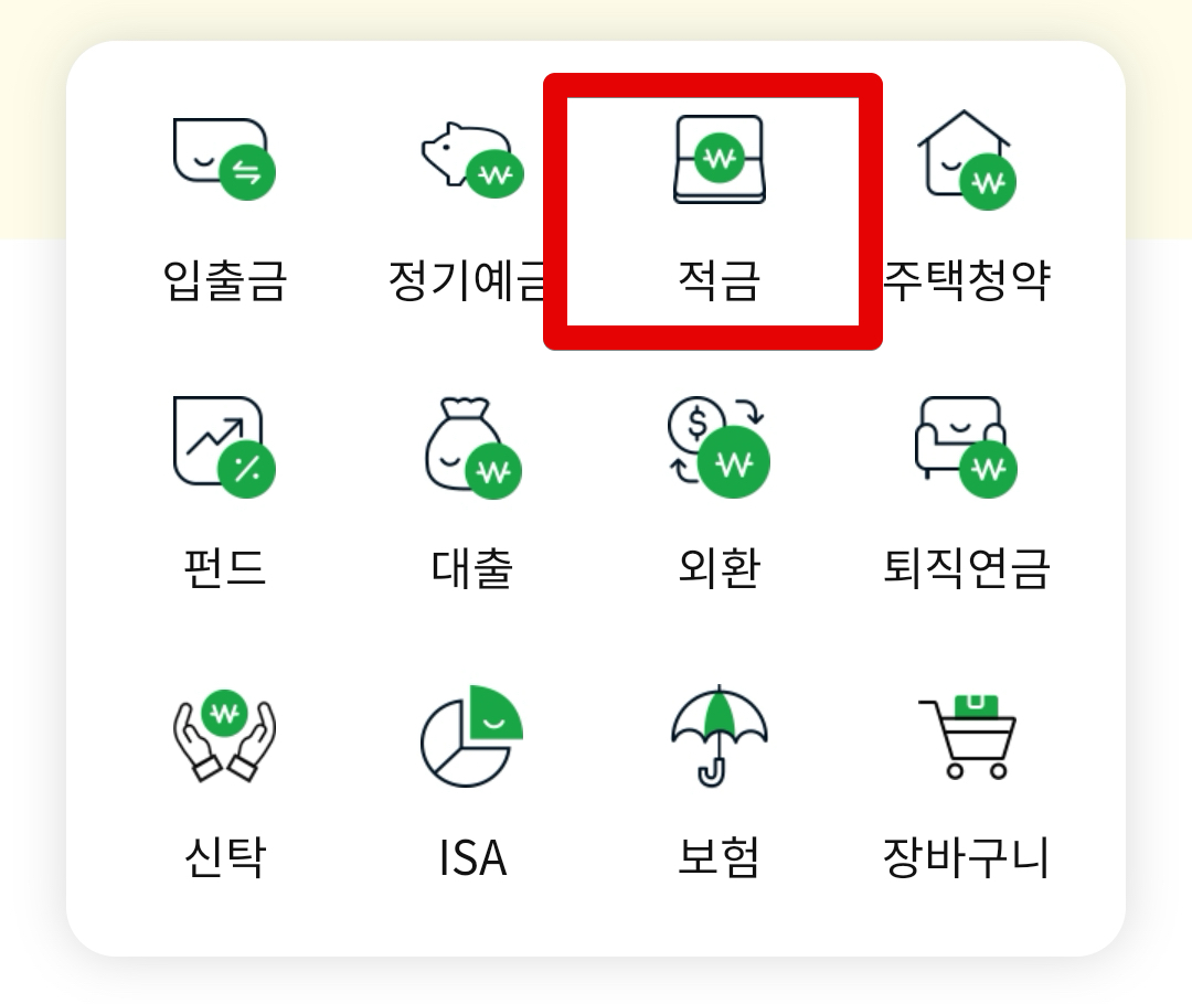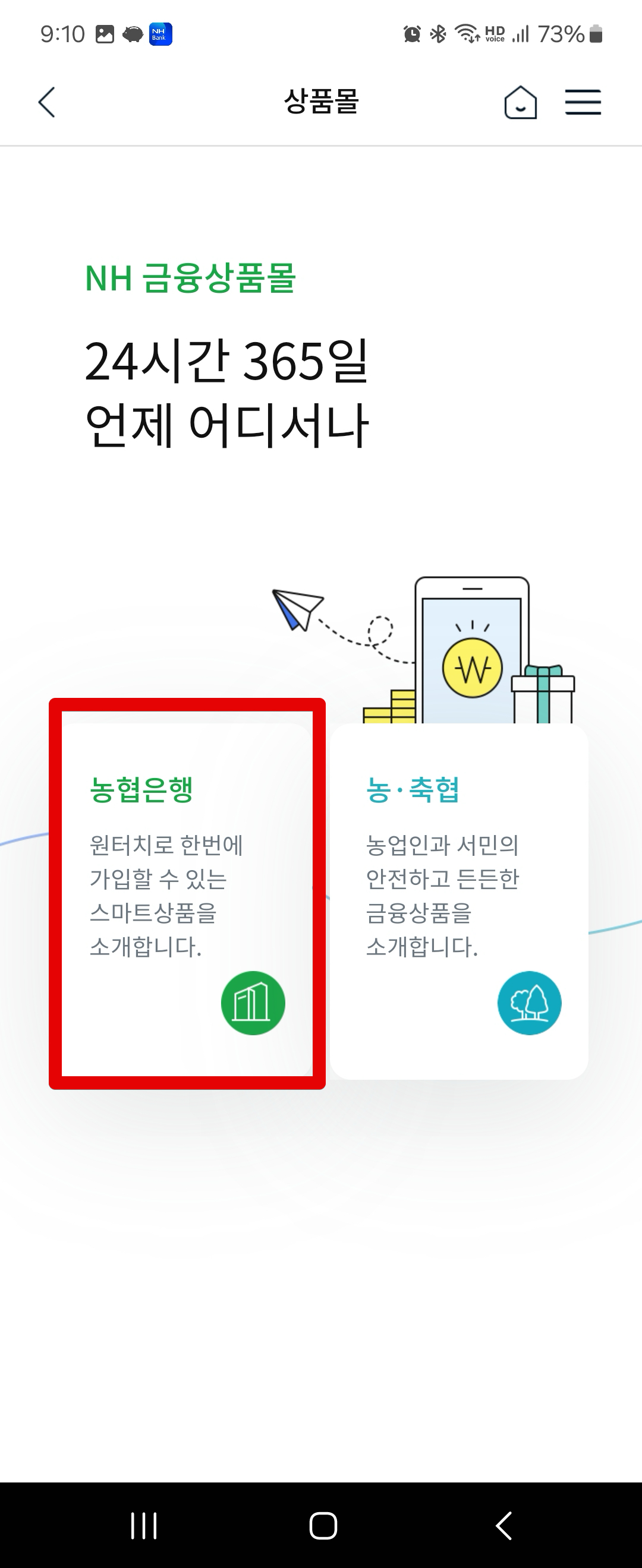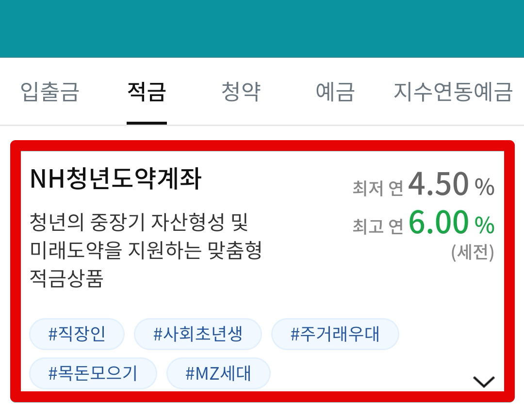 첫 화면이 나타나면 [농협은행]을 선택해주고, 다음 칸에서 상품을 고르는 창이 나타나면 여기에서 [적금]을 선택합니다. 청년도약계좌는 '적금' 상품입니다.