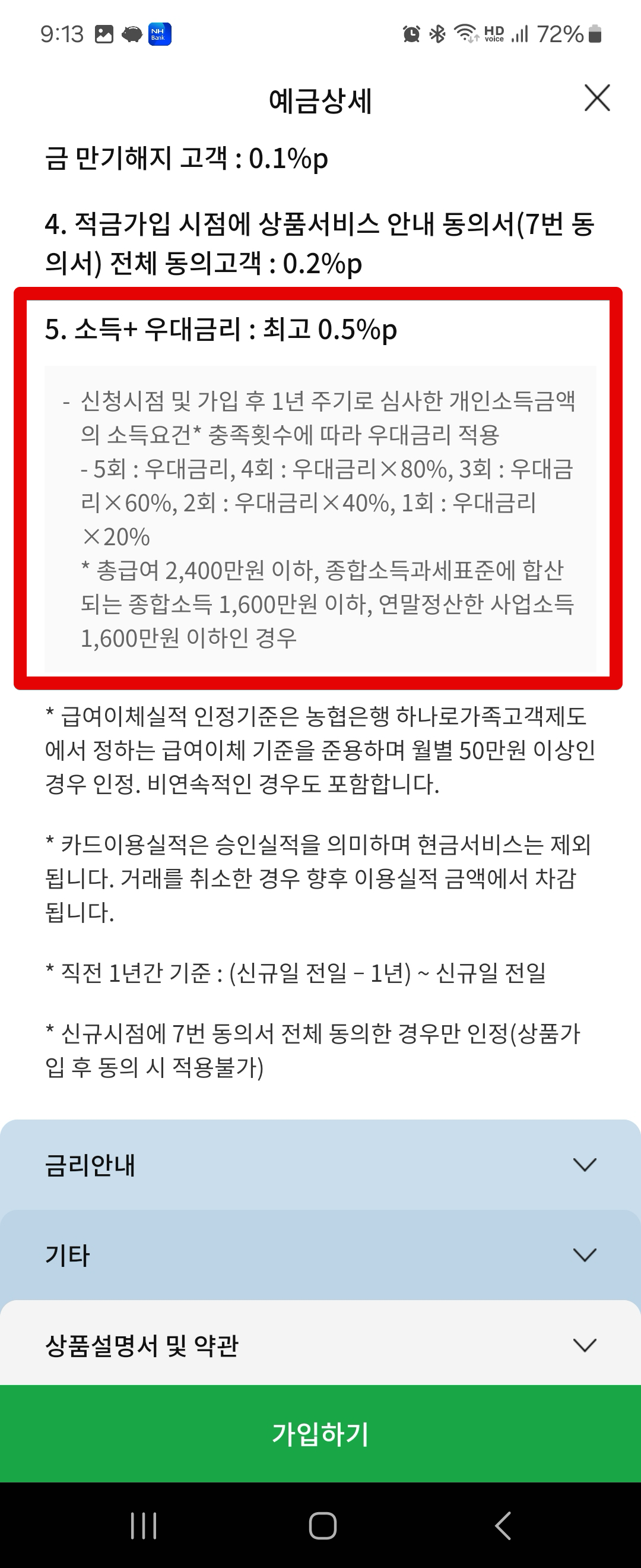 이후 신용카드 사용과 급여이체 달성하면 만기시에는 추가 우대금리 0.7%를 받을 수 있겠습니다.