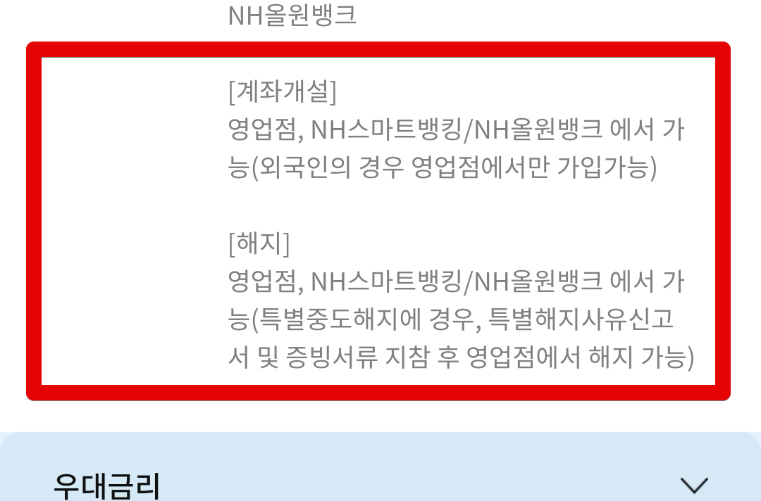 계좌개설과 해지 부분을 살펴보면, 계좌 개설의 경우 NH스마트뱅킹 앱에서 진행이 가능하며, 해지 역시도 NH스마트뱅킹이나 NH올원뱅크 앱으로 진행이 가능합니다. 그런데 여기에서 중요한점이 특별중도해지일 경우, 증빙서류 및 사유신고서를 지참해서 영업점에 내방해야만 해지가 가능하다고 합니다.
