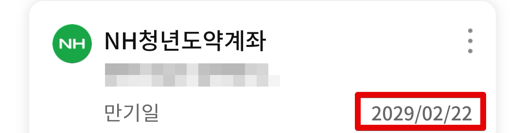 끝으로 농협 앱 계좌 목록 화면에 보면, 이제는 청년희망적금이 없어지고 청년도약계좌가 그 자리를 새롭게 차지한 모습을 보실 수 있습니다. 만기일은 2029년 2월 22일입니다.