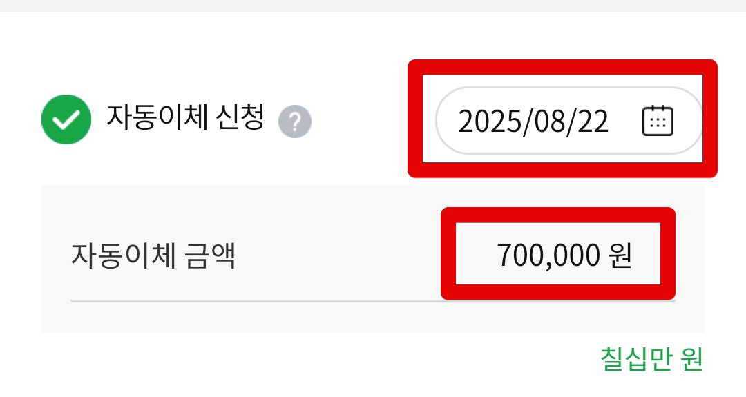이제 자동이체 날짜를 입력해야하는데 이 부분이 조금 헷갈리더라고요. 기본적으로 청년도약계좌 상품 자체는 처음에는 일시납입을 고려하지 않고 시스템이 만들어져 있기 때문에, 예를들어 2월 22일에 가입한다치면 자동이체 날짜는 3월 22일로 자동 잡히도록 시스템이 만들어져 있습니다.