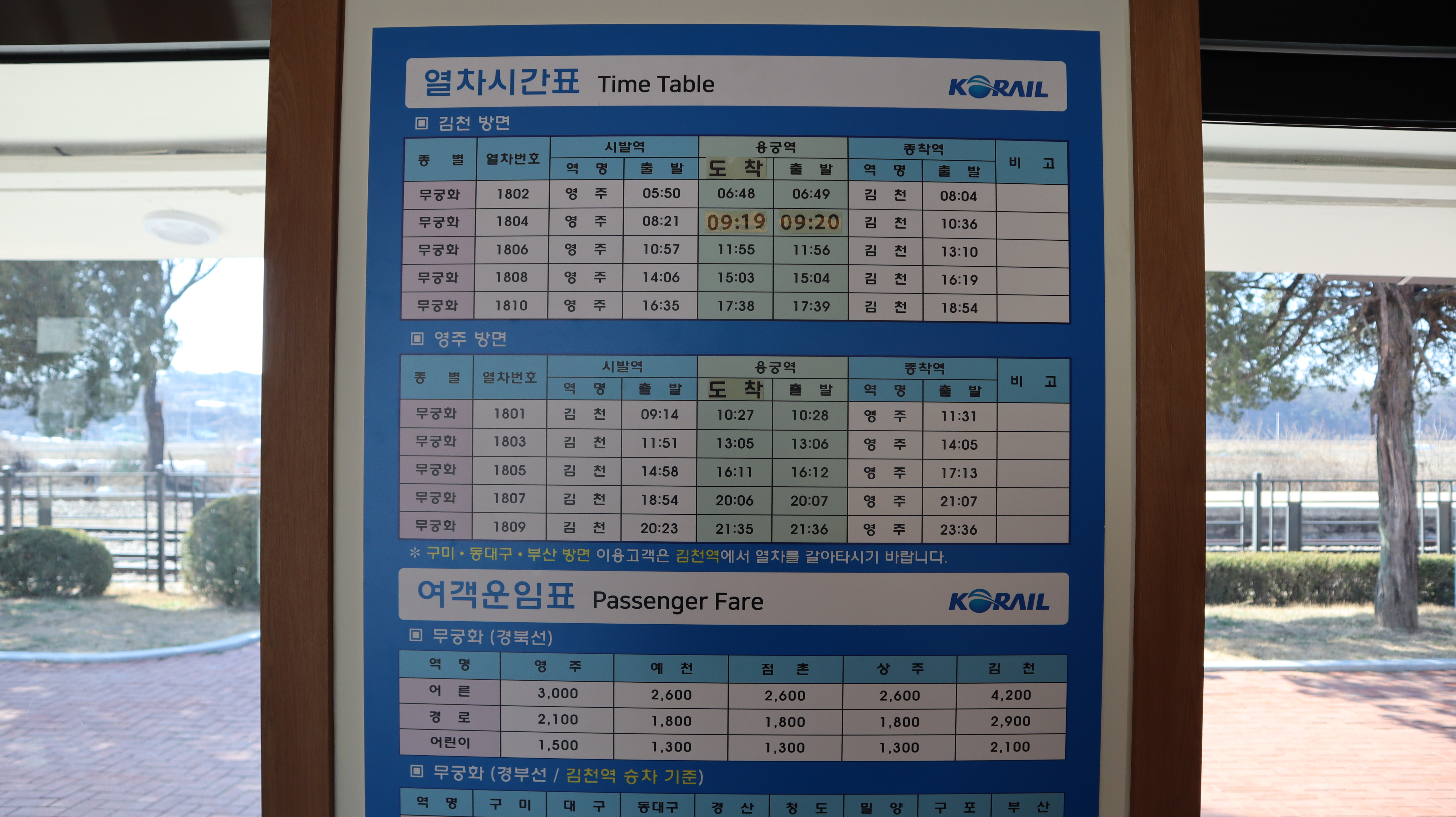 예천 용궁역 열차 시간표도 있으니 참고해주세요. 무궁화호를 타고 영주와 김천 등으로 갈 수 있습니다.
