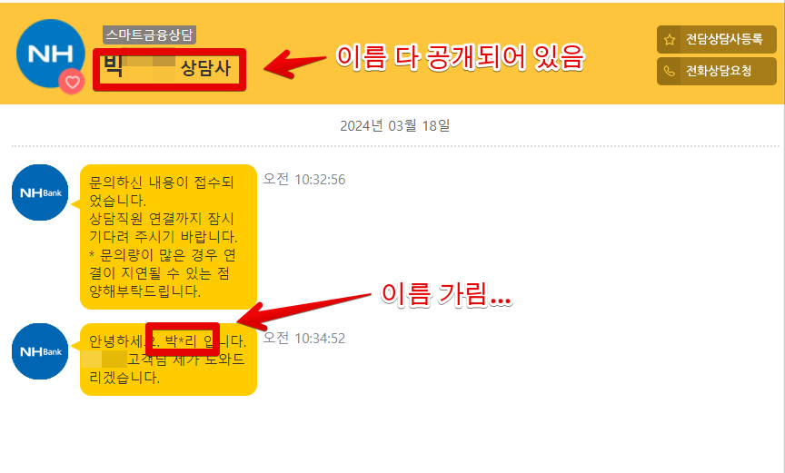 채팅창이 열렸는데... 농협 채팅상담은 저도 처음 이용해보았는데요. 한가지 재미있는게 채팅 내용에서는 상담사 이름이 중간 글자가 *표시가 돼 있는데 최상단에는 이름 석자가 그대로 공개되더라고요. 무슨 의미인가... 싶긴 했었습니다.