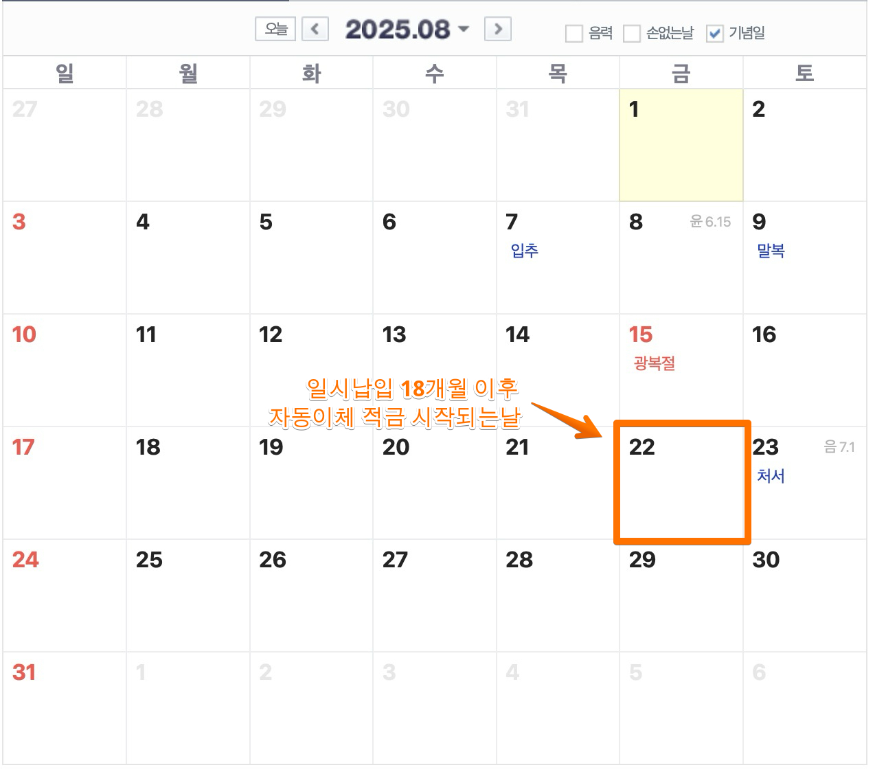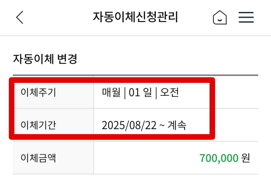 2024년 2월 22일 가입 이후 18개월이 흐른 다음 적금 자동이체 날짜는 자동으로 2025년 8월 22일로 잡힙니다. 그리고 이렇게되면 자동이체 주기가 매월 22일로 자동 생성되기 때문에 이 부분을 변경해주어야 합니다.