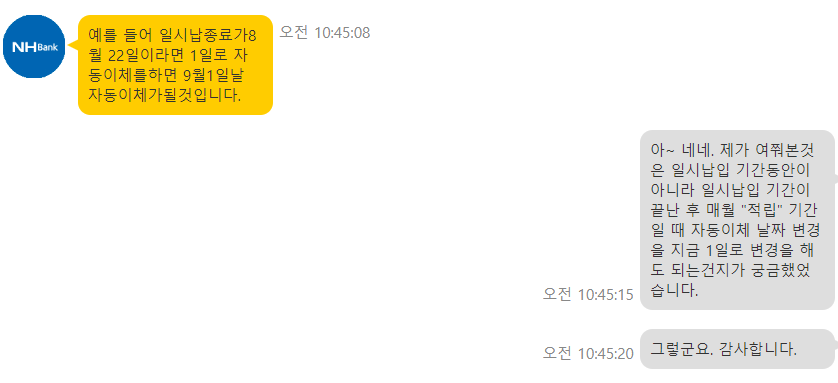 이후 이런저런걸 물어보다가 일시납입 종료가 8월 22일이라고 할 때, 자동이체를 매월 1일로 자동이체 잡으면 9월 1일로 자동이체가 될 수 있다고 답변받았습니다. 하지만 이것도 조금 긴가민가해서 실제로 2025년 8월에, 그러니까 지금으로부터 18개월 이후에 실제로 적금 납부가 되자마자 다시 한 번 매월 1일로 자동이체 변경을 해주거나 다시 한 번 전화 문의 등을 통해 재확인해볼 생각입니다.