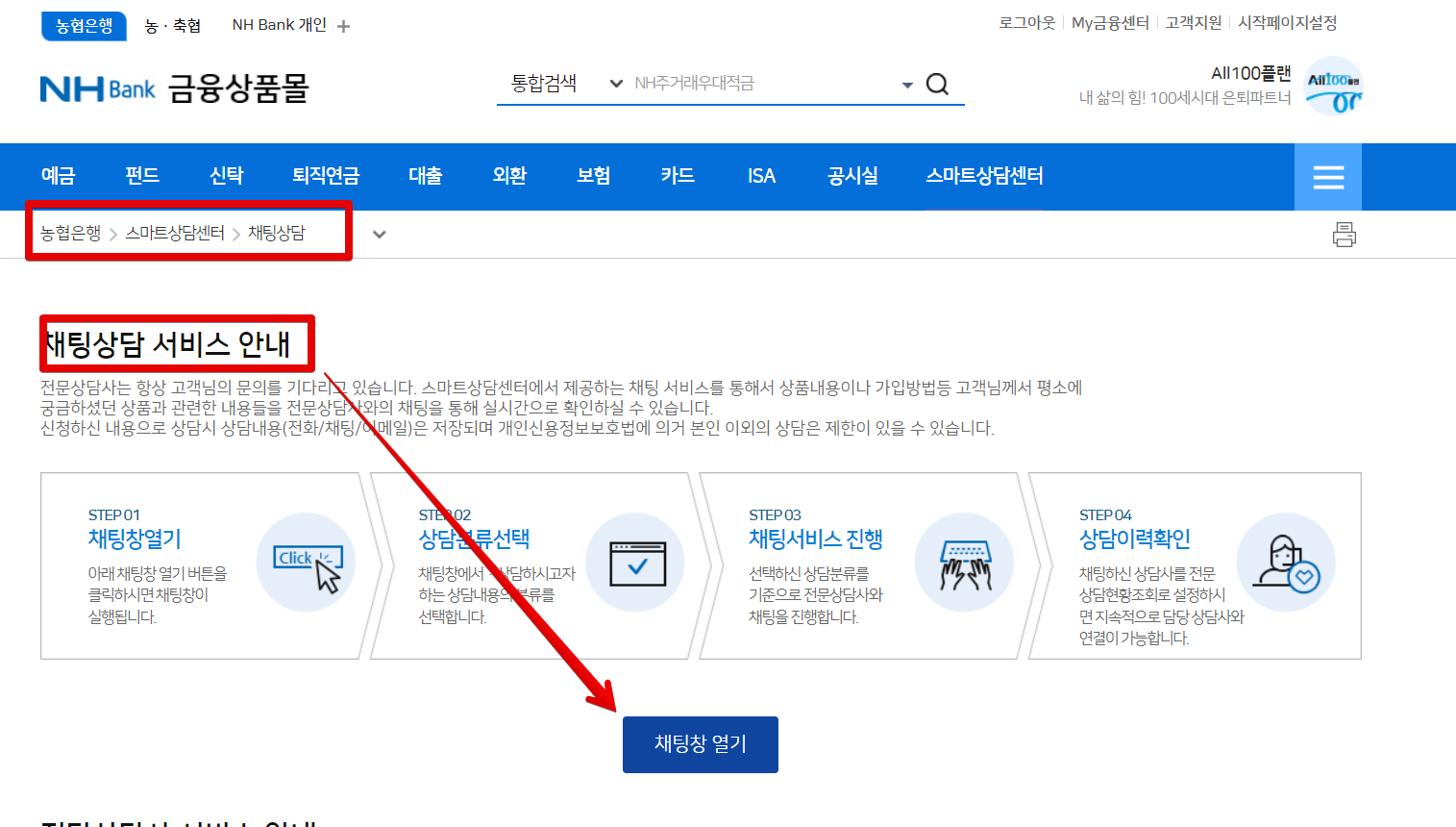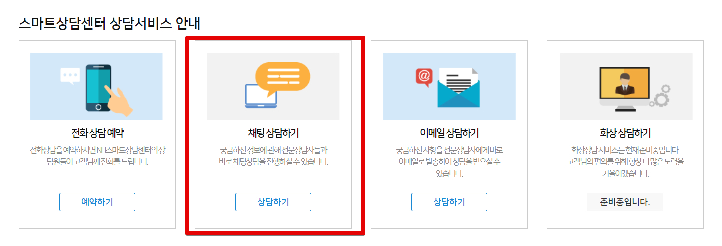 농협 채팅상담은 농협은행 홈페이지에서 로그인 후 [스마트상담센터 상담서비스 안내]에서 [채팅상담]을 진행하면 됩니다.