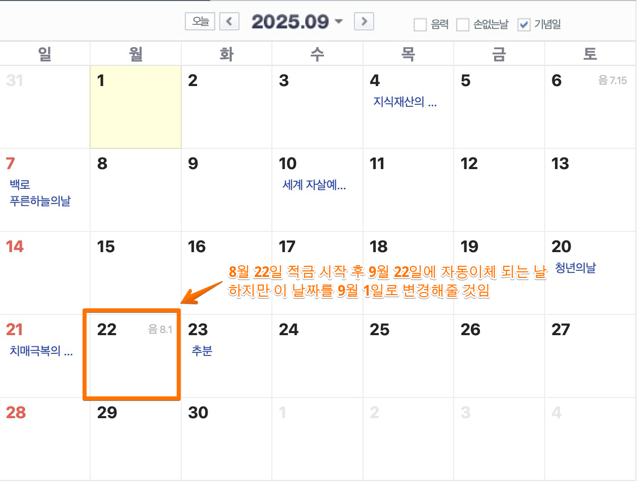 원래대로 그대로 둔다면, 2025년 8월 22일에 적금 이체, 다음 2025년 9월 22일에 적금 이체가 이뤄지겠지만, 8월 22일에 납부 이후 9월부터는 매월 1일에 적금이 납부되는걸로 변경해줄 것입니다.