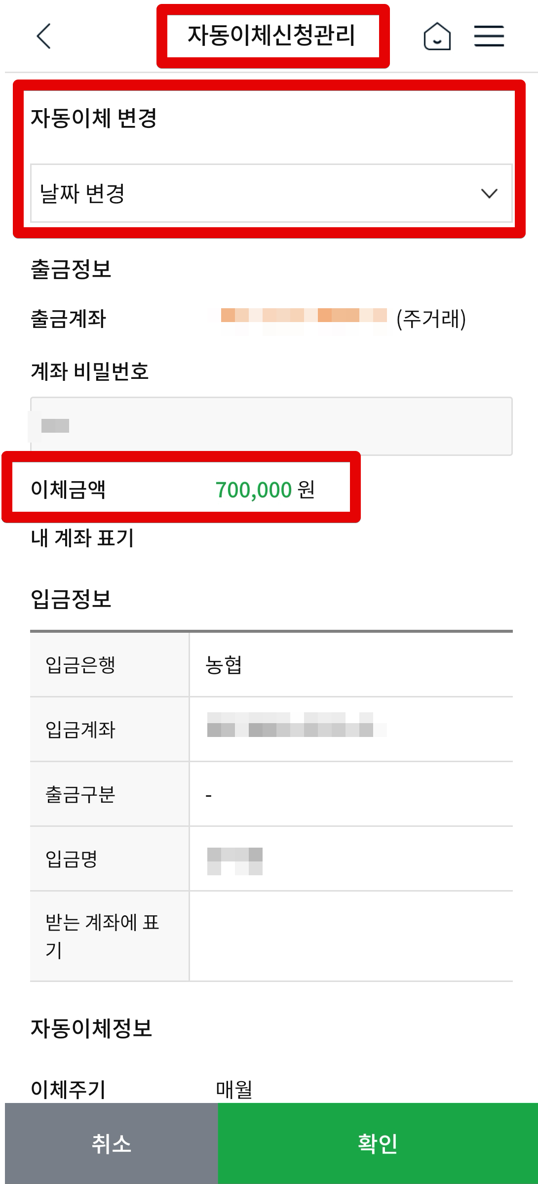 자동이체 일정 변경은 농협 앱에서 진행합니다.