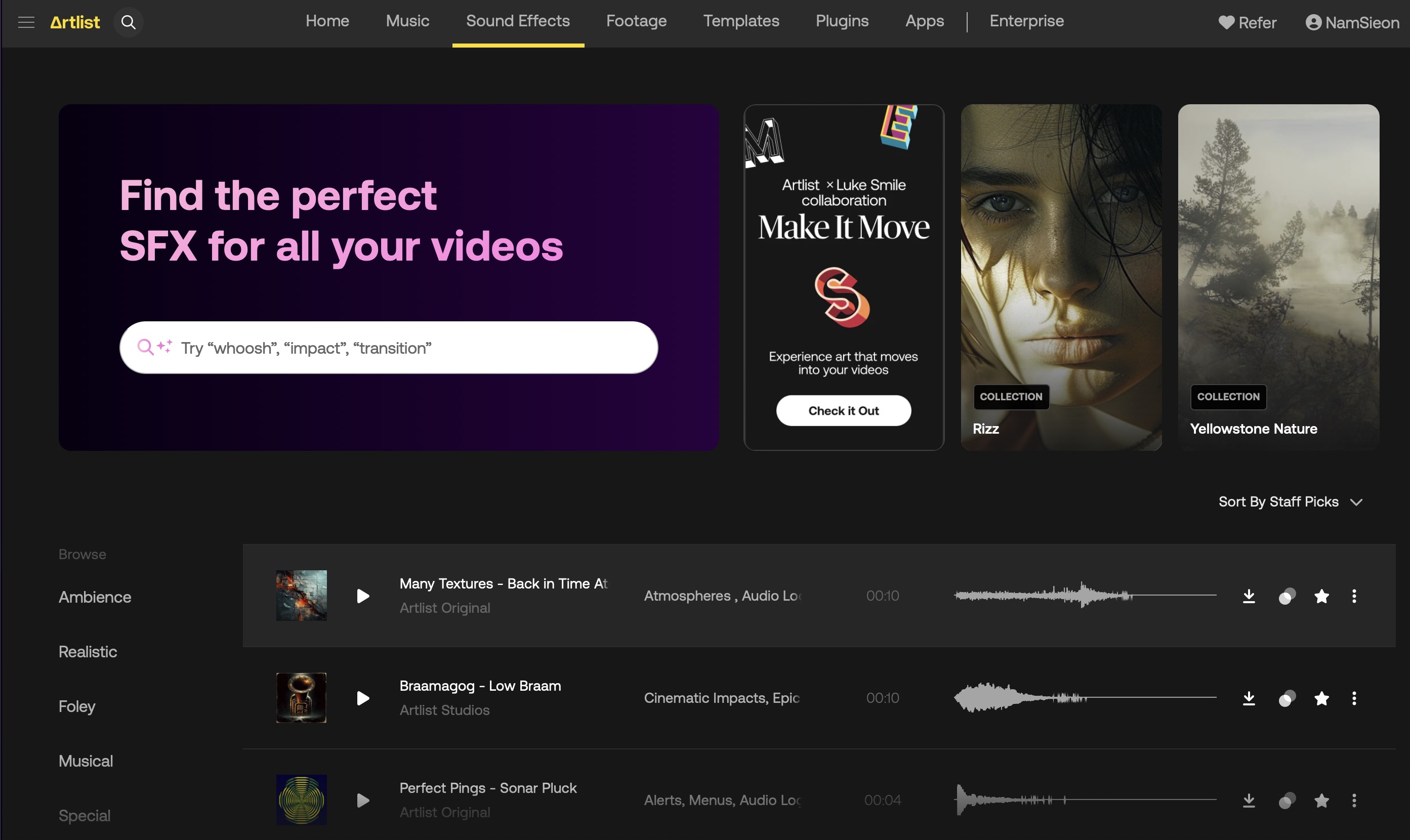 아트리스트에서 쓸 수 있는 SFX, 사운드이펙트 효과음을 쓸 수 있고 다양하고 고퀄리티 효과음들이 많아서 또 추천하고 싶은데요.
