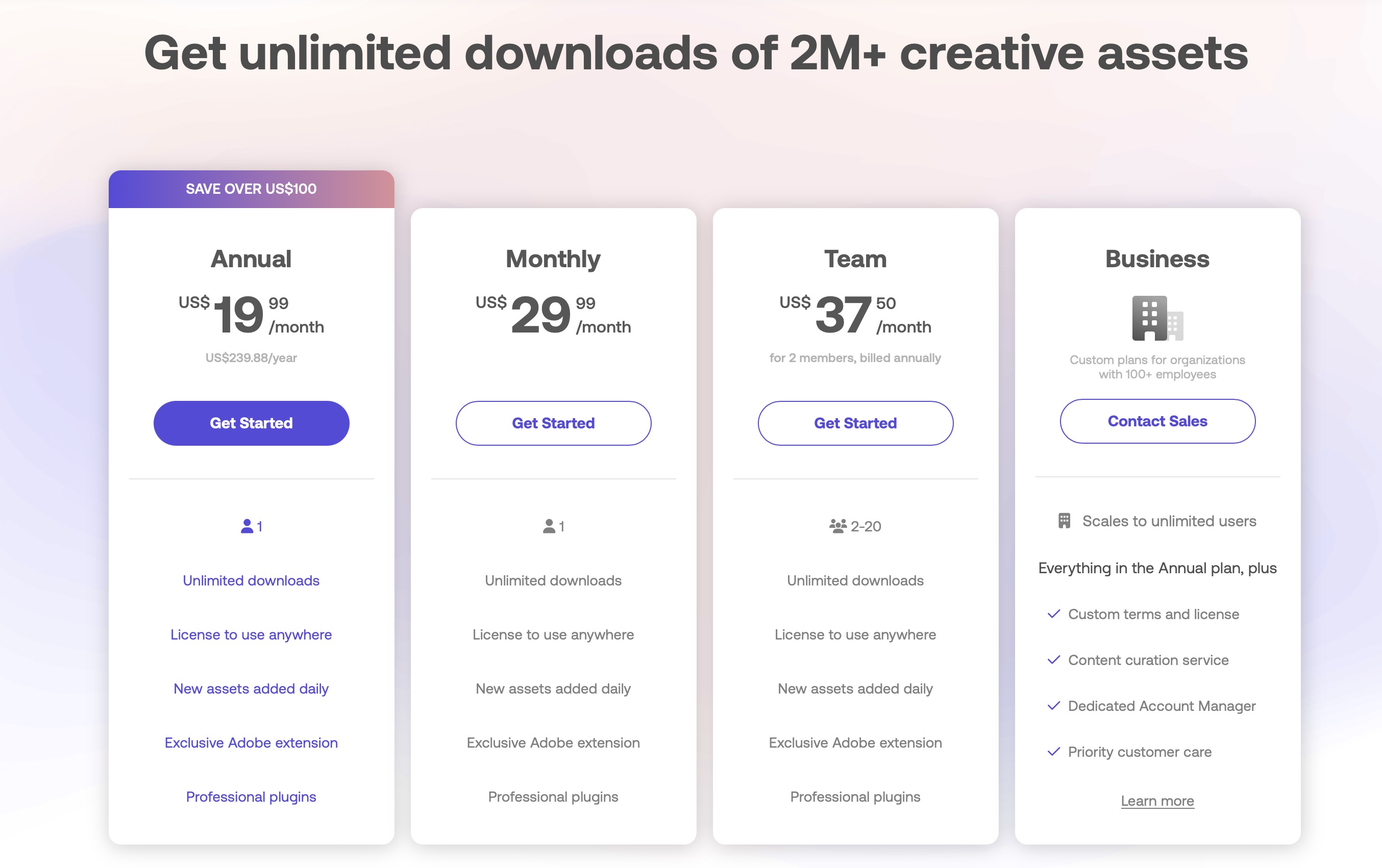 모션 어레이는 가장 저렴한 디지털 자산 구독 서비스 중 하나입니다. 한 달에 19.99달러 또는 연간 239,99달러(한 달에 약 20달러)로 라이브러리의 모든 자산과 여러 비디오 제작자의 도구, 독점 플러그인 및 250GB의 저장 공간에 무제한으로 액세스할 수 있습니다. 이러한 가격 정책은 과거부터 운영해오던 일부 스톡 영상 웹사이트에서 단일 HD 동영상을 구매하는 것과 비교할 때 훨씬 저렴한 편에 속합니다. 저는 모션어레이의 장점 중 한가지가 바로 이러한 저렴한 가격 정책에 있다고 생각하는데요. 모든 종류의 동영상 크리에이터나 예산이 넉넉하지 않은 1인미디어 또는 사업자분들도 전문적인 콘텐츠를 만들 수 있도록 도움을 줄 수 있습니다.