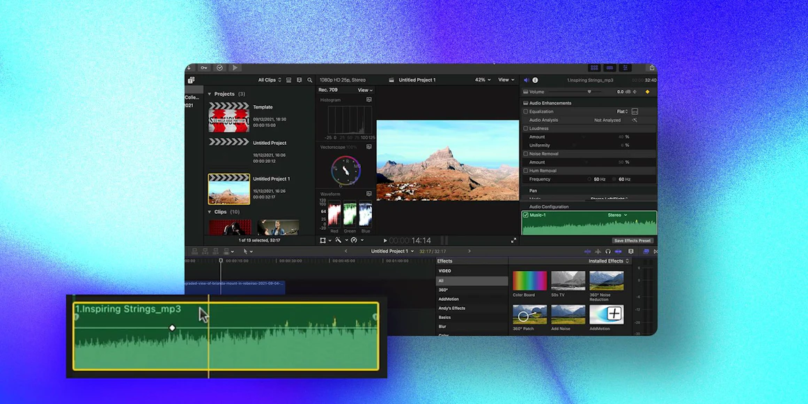 모션어레이에는 음악과 효과음을 제공하는 라이브러리가 있으며, 모든 것이 구독에 포함되어 있습니다. 그러나, 음악과 SFX에만 관심이 있다면, 로열티 없는 최고의 음악 사이트인 Artlist를 추천합니다. 모션어레이는 음악과 효과음'만' 사용하기보다는 음악과 효과음 외에도 다양한 템플릿이나 스톡푸티지 등을 함께 이용하고 싶을 때 훨씬 더 효과적입니다.