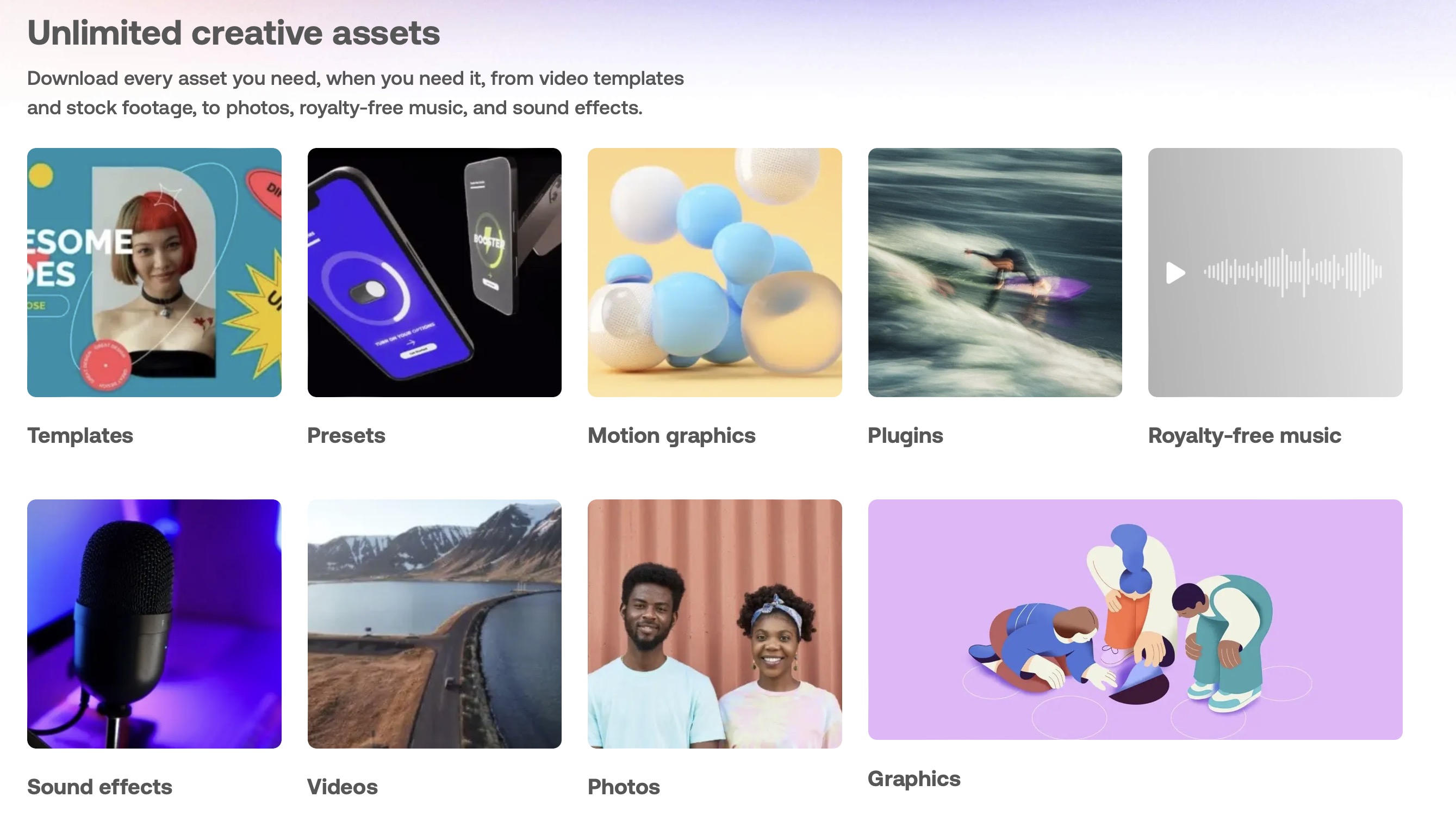 Create your projects with unlimited asset downloads: premium Templates, Presets, Stock Photos, video elements and a website builder - all in one membership!