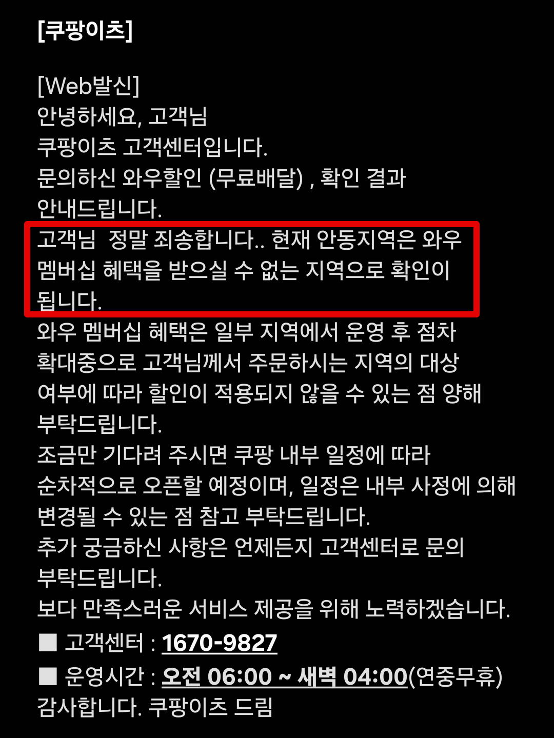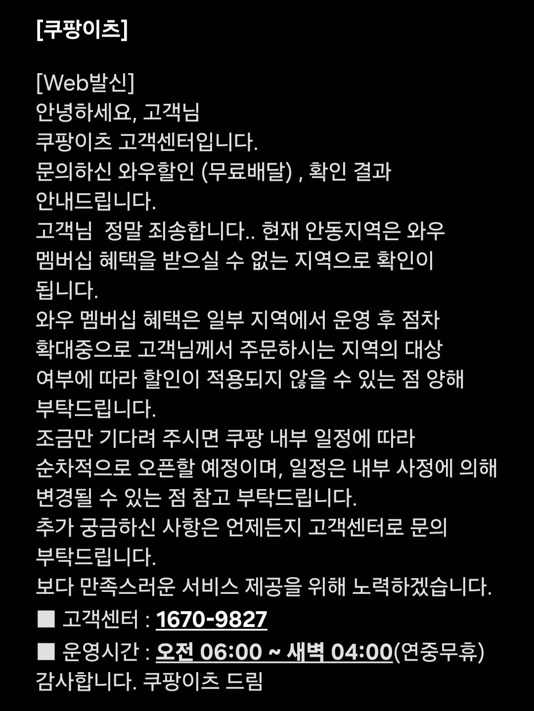 쿠팡이츠 무료배달 와우멤버십 할인혜택 경북 안동 지역 될까? 문의결과