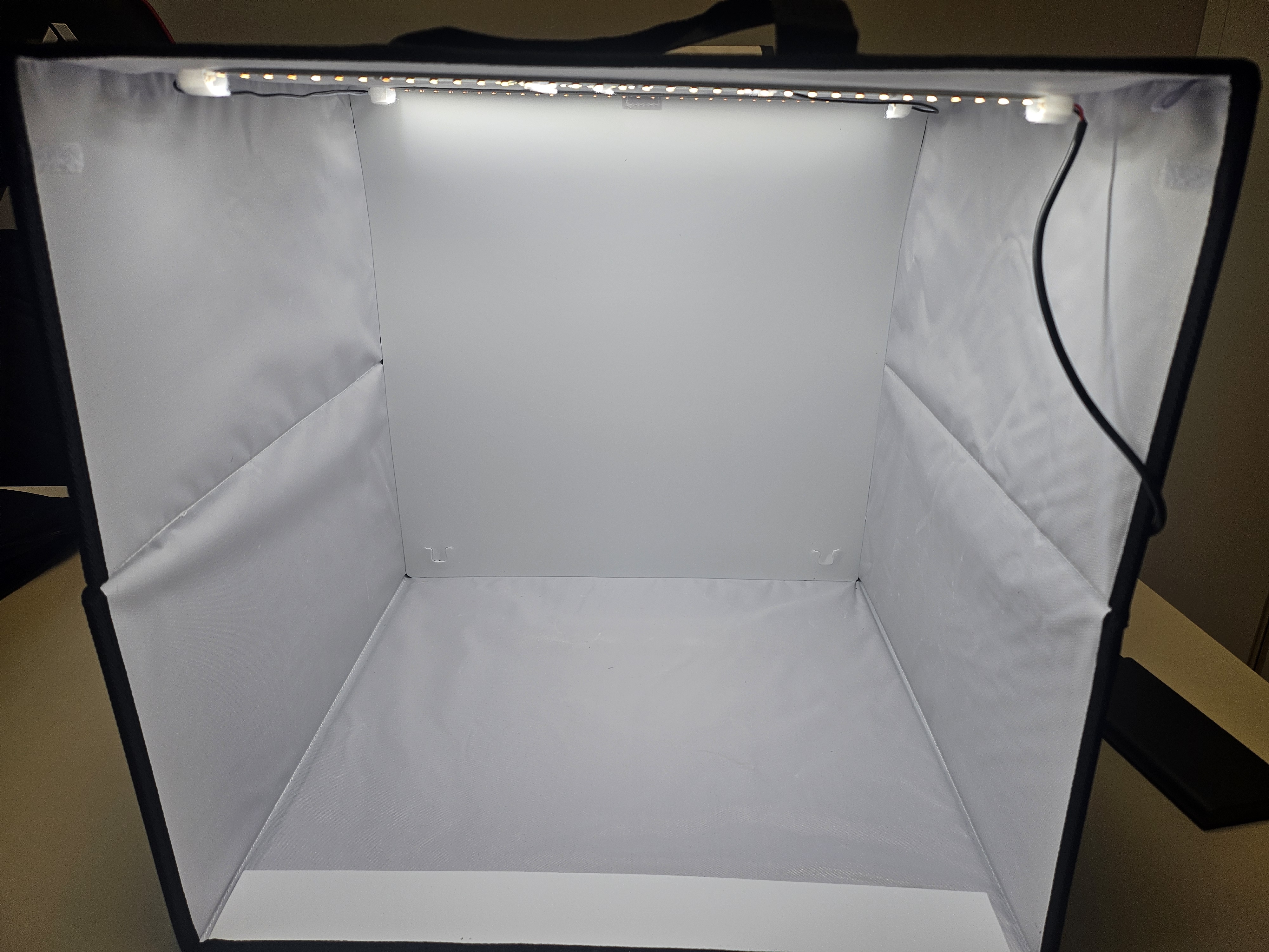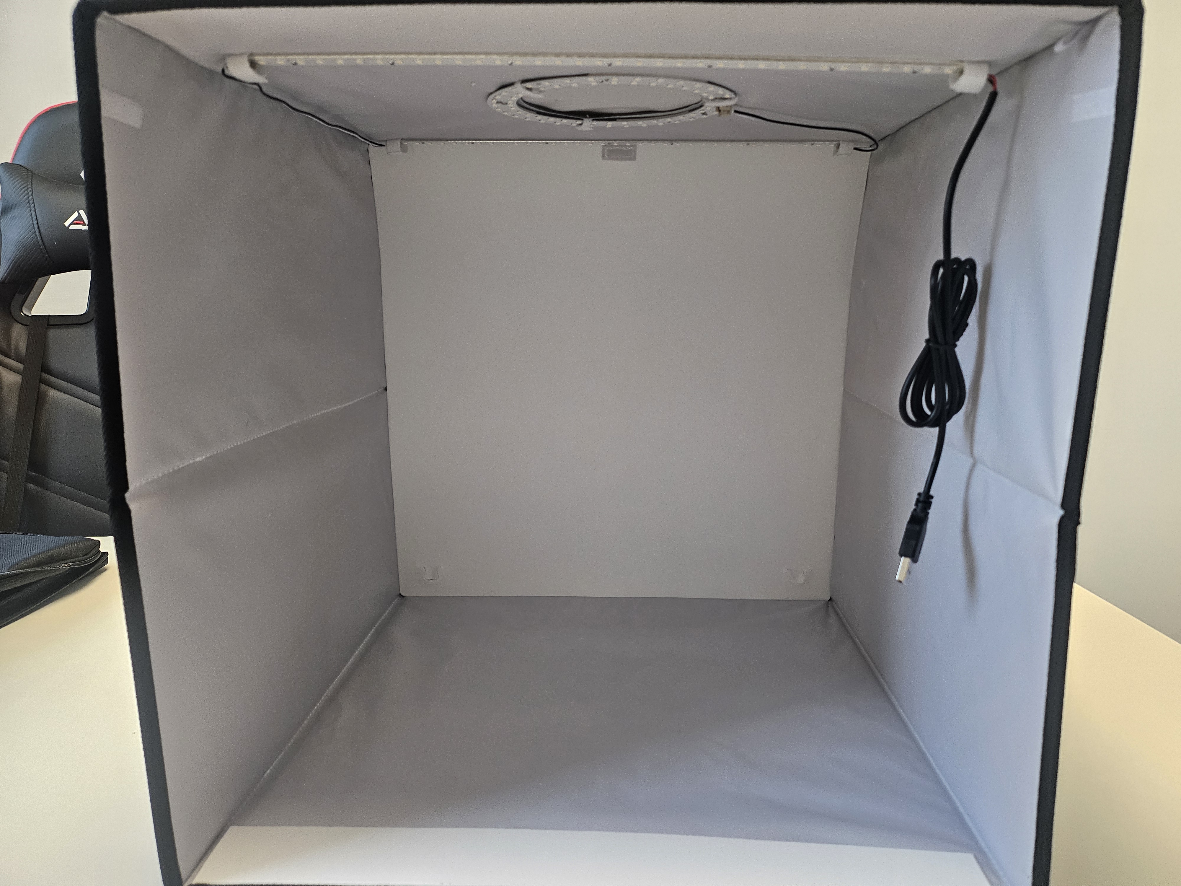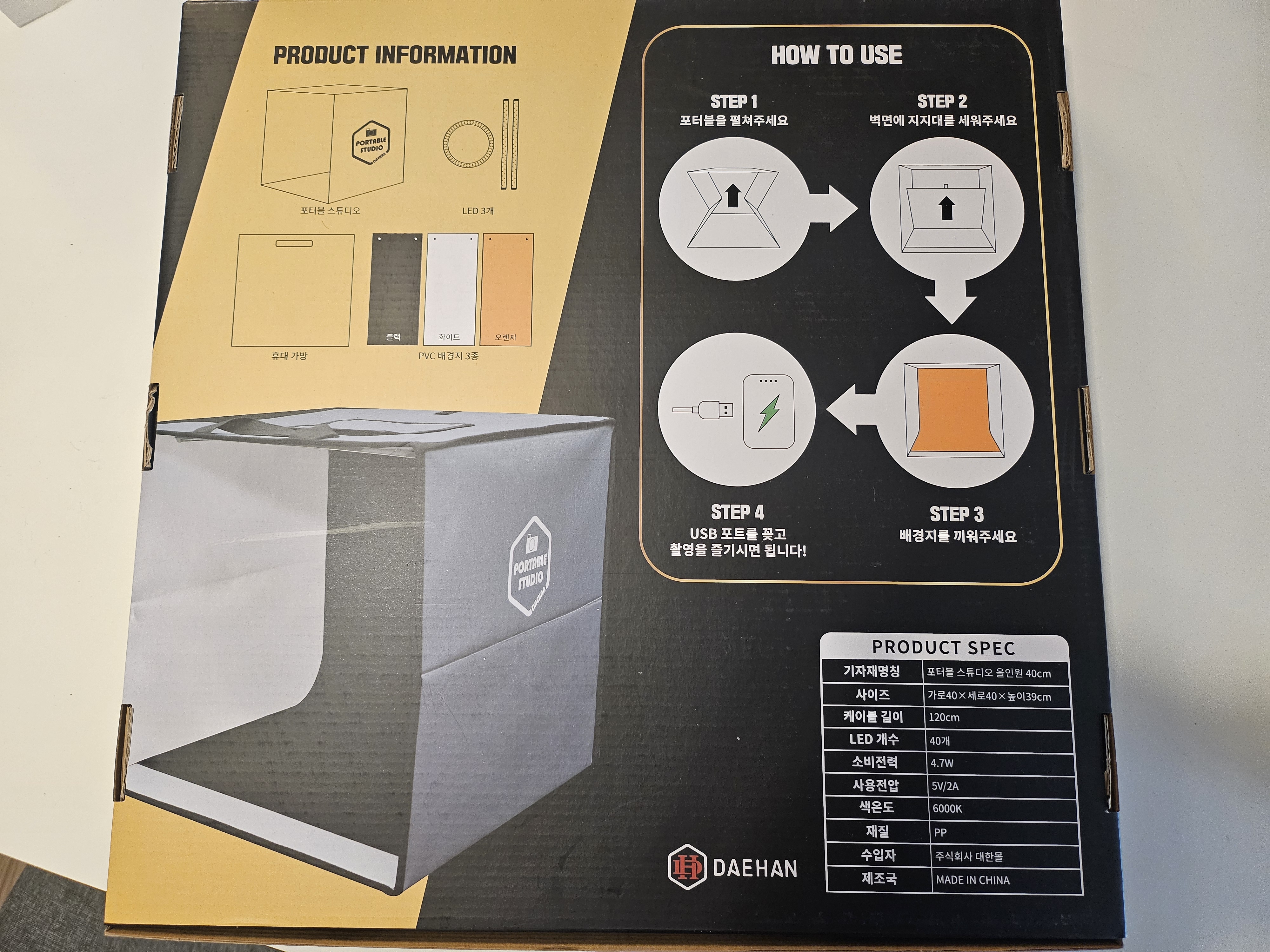 원터치 정도로 바로 설치할 수 있는 제품이었고요. 대한이라고 하는 곳에서 나온 제품이에요. 배경지를 깔아서 색깔을 변경할 수 있고, 배경지는 별도로 판매도 하고 있었습니다. 내부 조명의 경우 엄청 밝진 않지만 상품 촬영 정도에 적절한 수준으로는 될 것 같았는데요. USB를 이용하도록 돼 있고 보조배터리를 연결해서 쓰면되어서 편리한 제품이었습니다.
