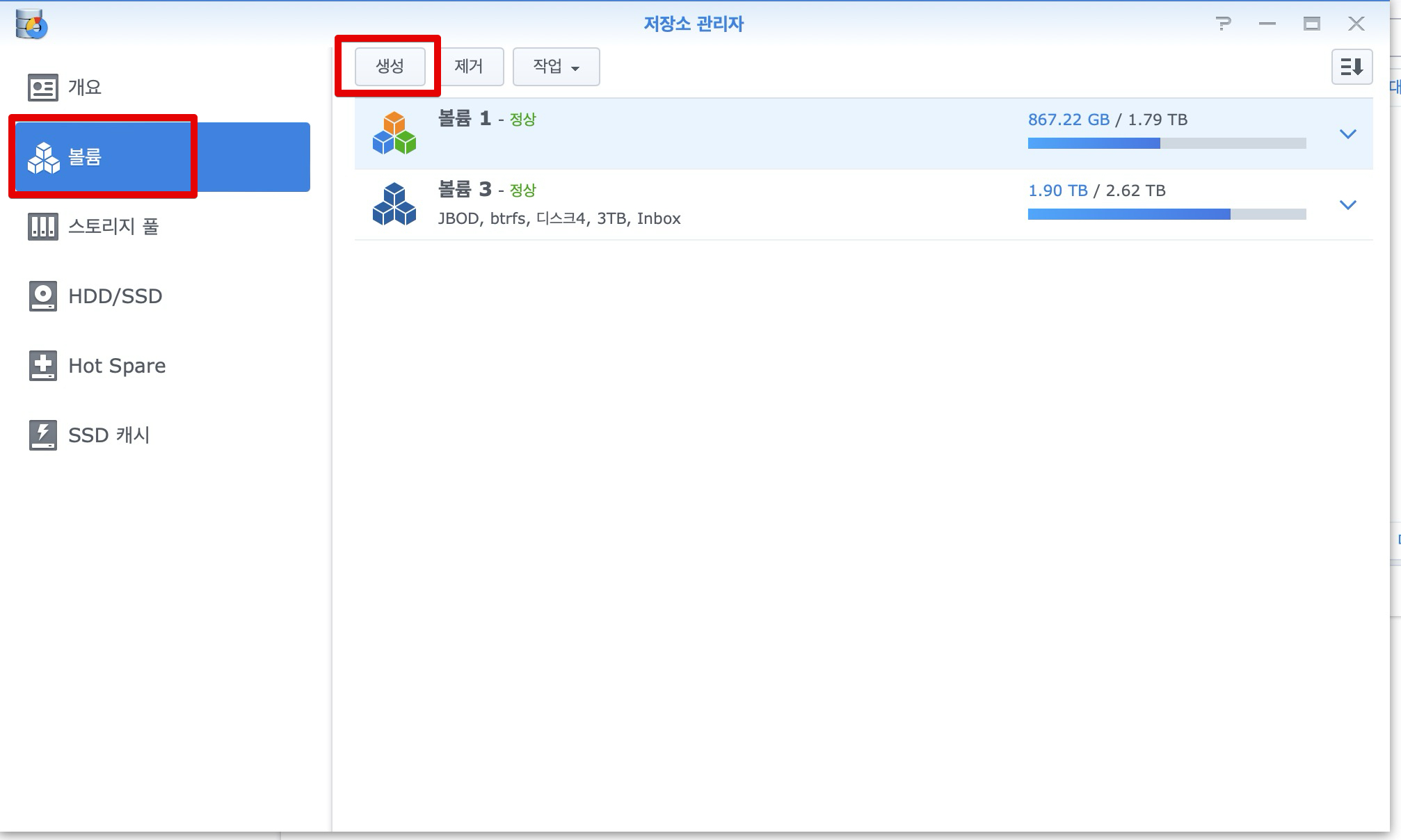 시놀로지 DSM에서 저장소 관리자로 들어간 다음 생성을 클릭합니다. 기존에 있었던 볼륨 2번이 포맷 후 사라진 모습을 볼 수 있었습니다.