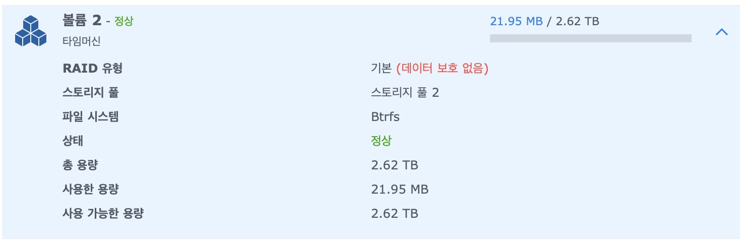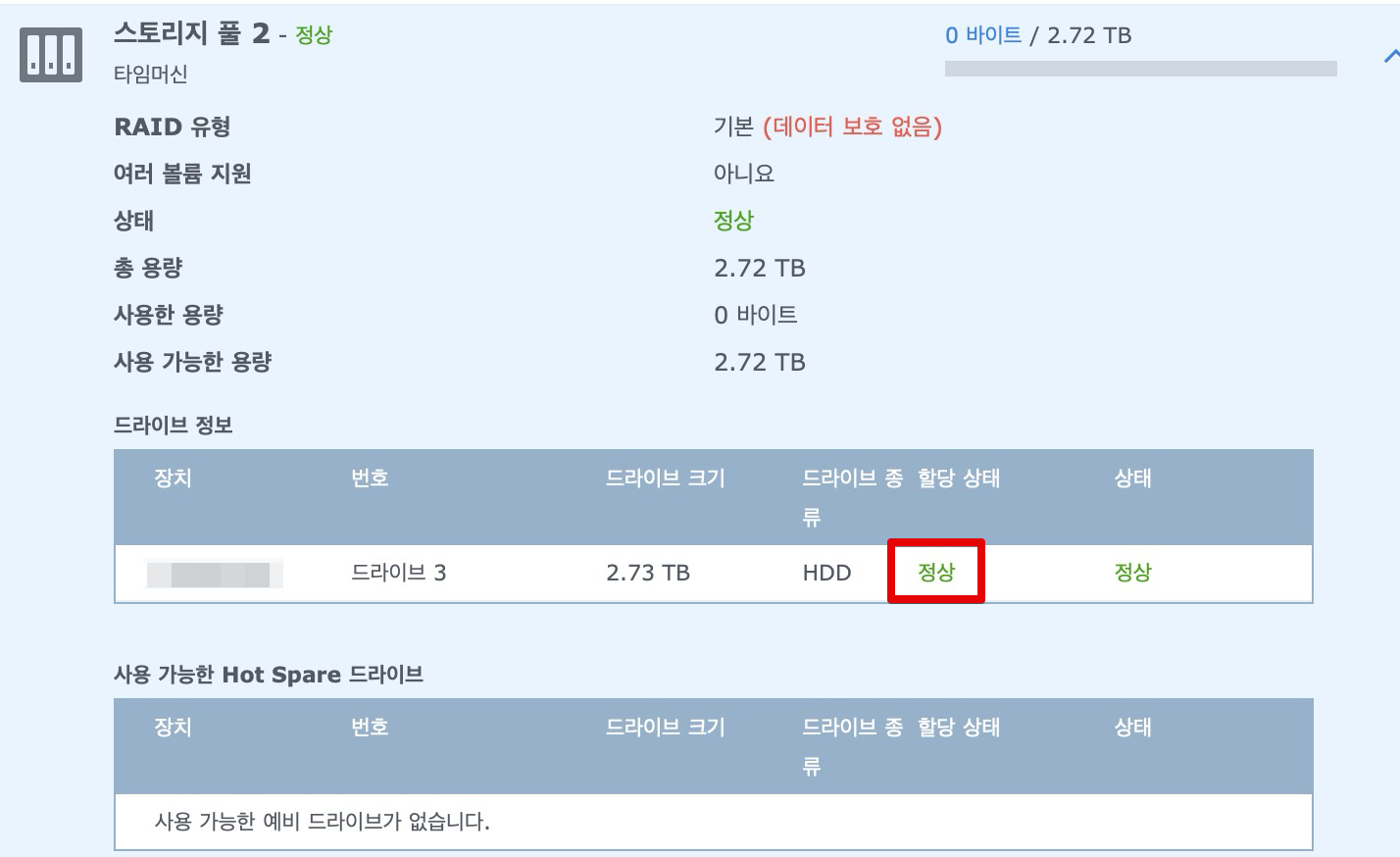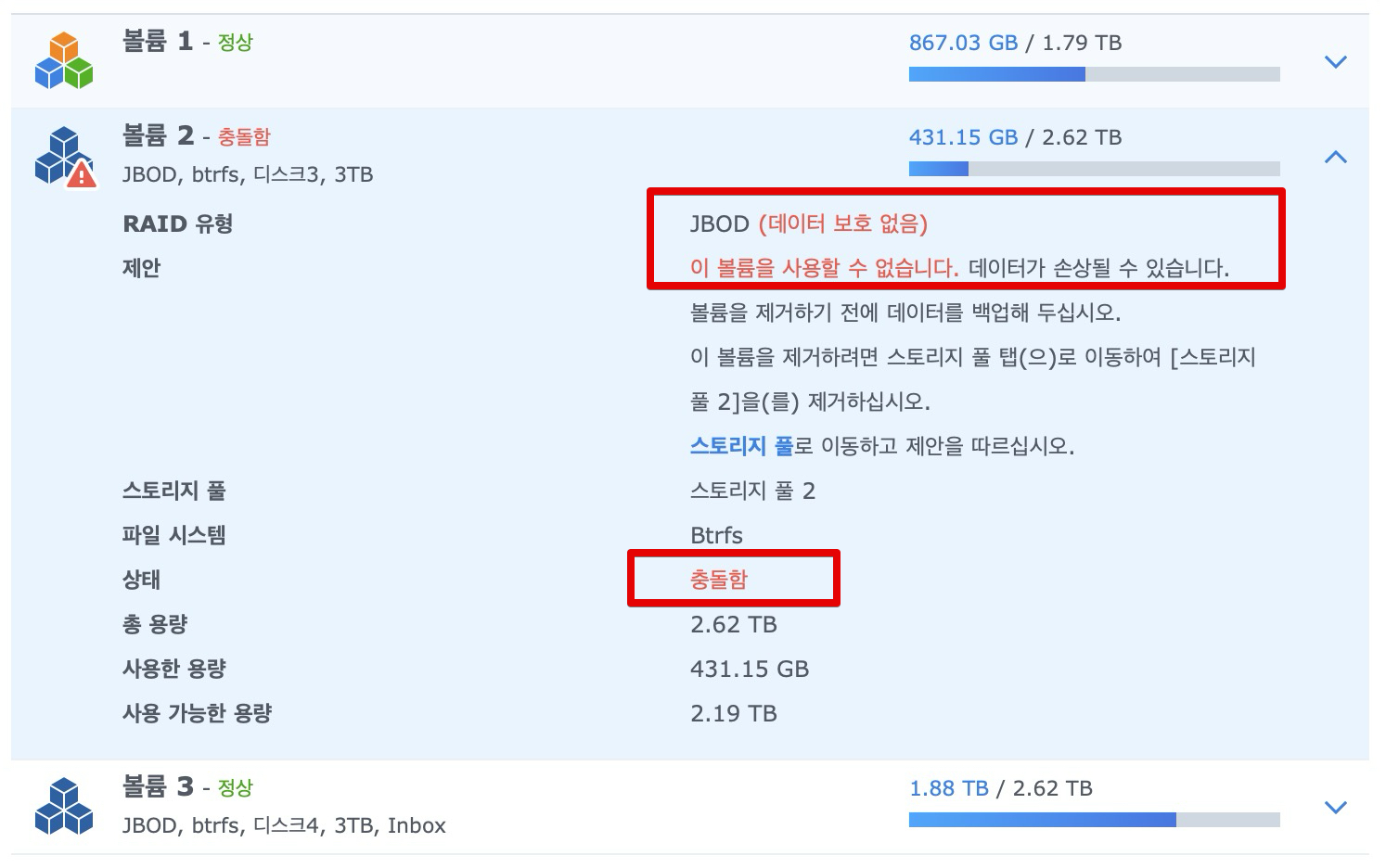이 볼륨을 사용할 수 없습니다. 데이터가 손상될 수 있습니다. 볼륨을 제거하기 전에 데이터를 백업해 두십시오. 라는 메시지가 나타나고 볼륨 상태창에 충돌함 이라는 상태가 나타났습니다. 이 상태는 제가 몇 년간 시놀로지 나스를 사용하면서 처음 겪는 경험이었기 때문에 살짝 당황스러웠어요. 해결해보려고 이리저리 노력해보았지만 별다른 대책이 떠오르지 않아서 해당 하드를 포맷하고 타임머신 백업을 다시 진행해주기로 결정하였습니다.