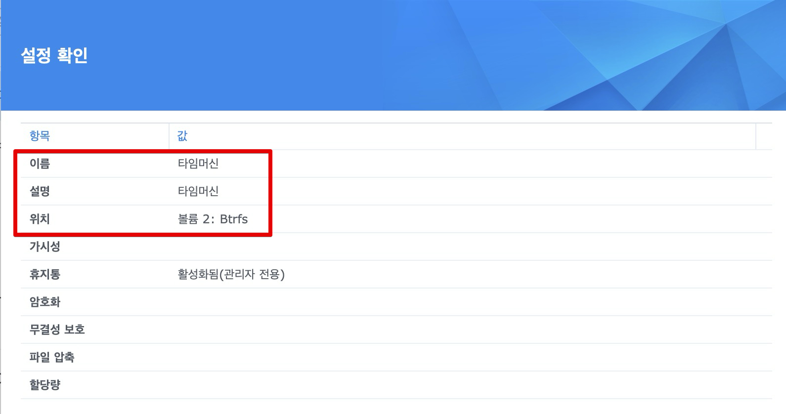 이제 시놀로지 나스에서 맥북 타임머신용 공유 폴더를 만들어주고 맥북 타임머신과 연결해줄 차례입니다.