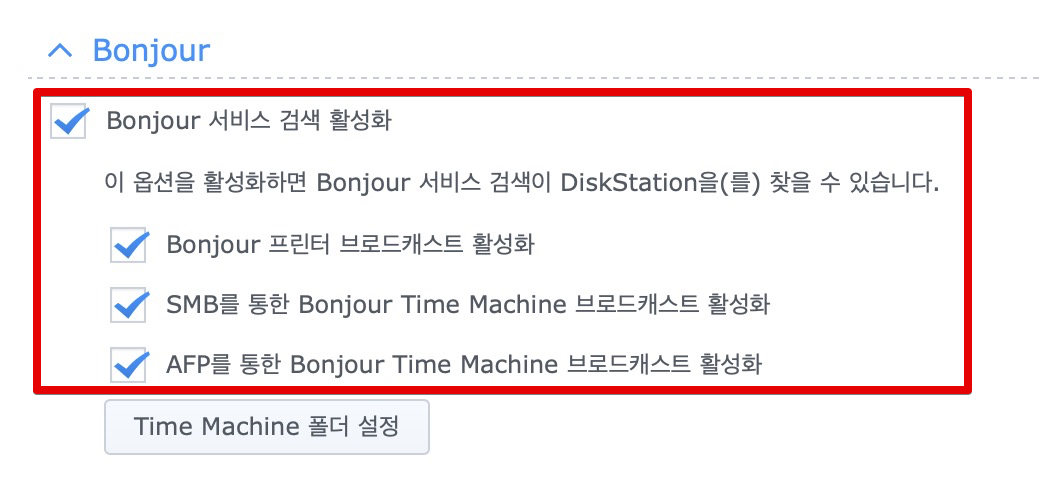 다시 DSM으로 들어와서 Bonjour 서비스 검색 활성화에서 모든 부분에 체크해주고 다시 시도하였습니다.