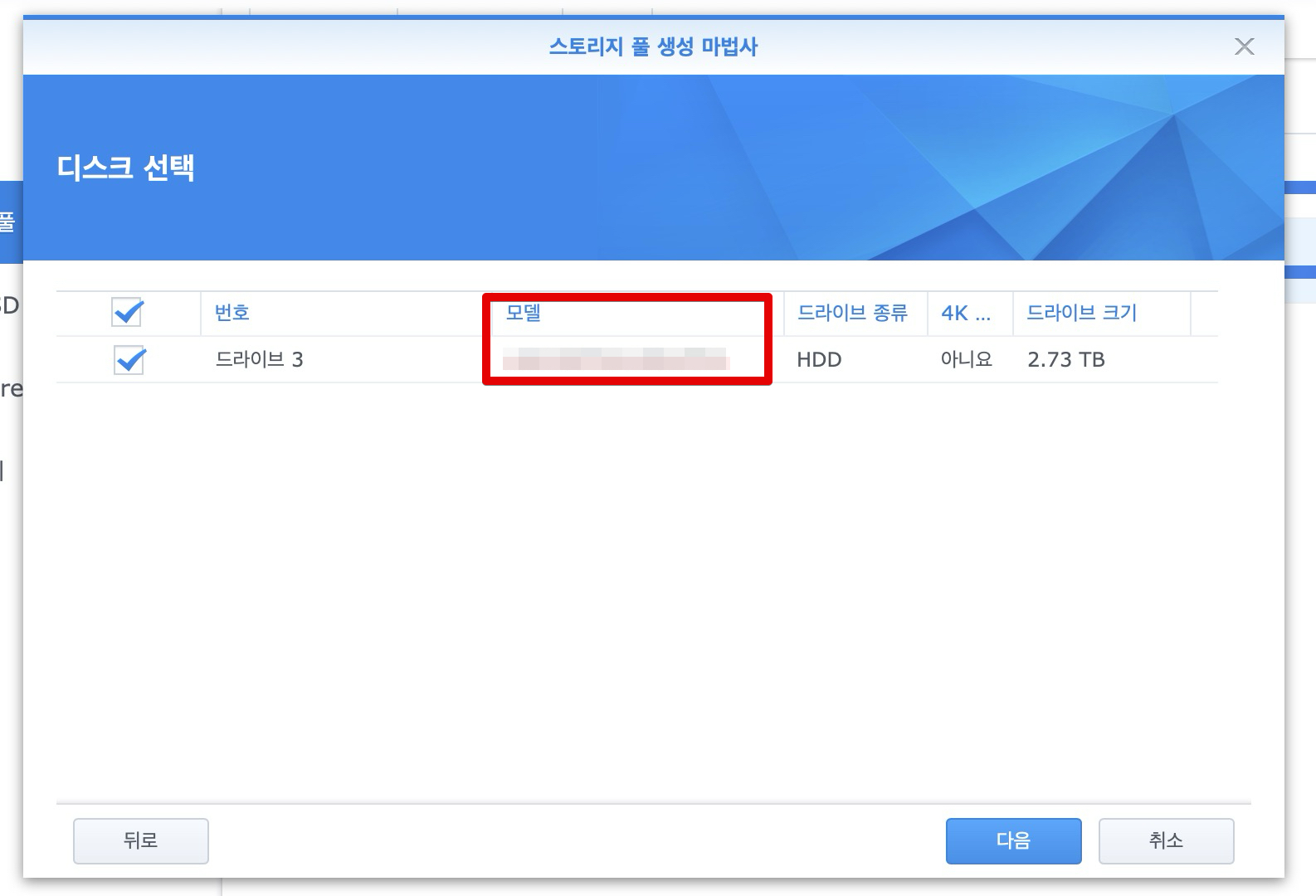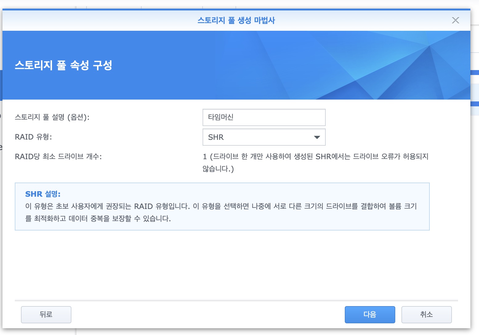 스토리지 풀 속성 구성이 나타나면 레이드 유형을 SHR로 잡고 넘어갑니다.