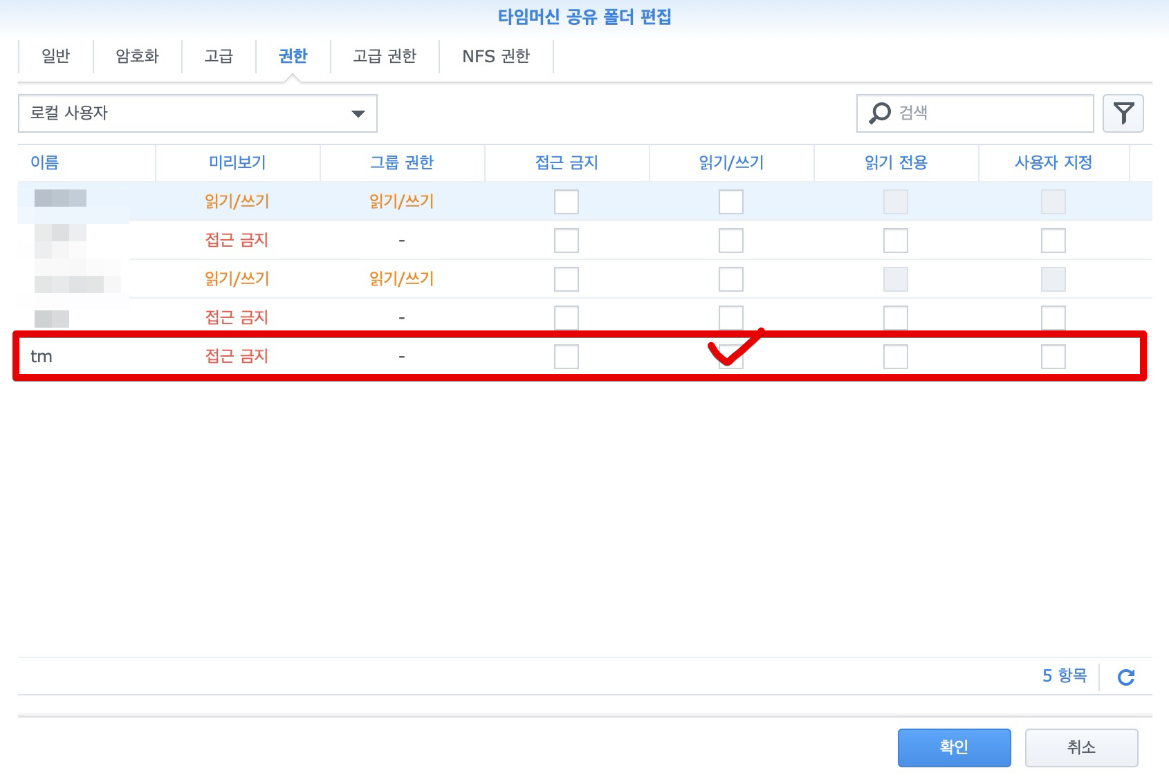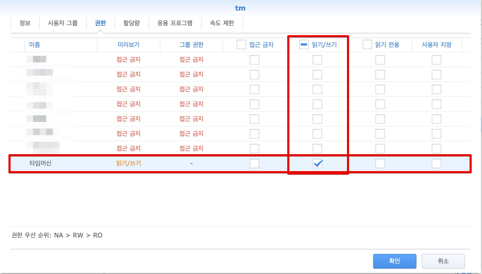 저기에서 적혀있는 tm 이라고 하는 계정은 타임머신의 약자 계정이며 제일 처음에 시놀로지 나스 타임머신과 연동할 때 생성해두었던 계정입니다. 만약 계정이 없다면 새로 계정을 만들어서 읽기/쓰기 권한을 주면 됩니다.
