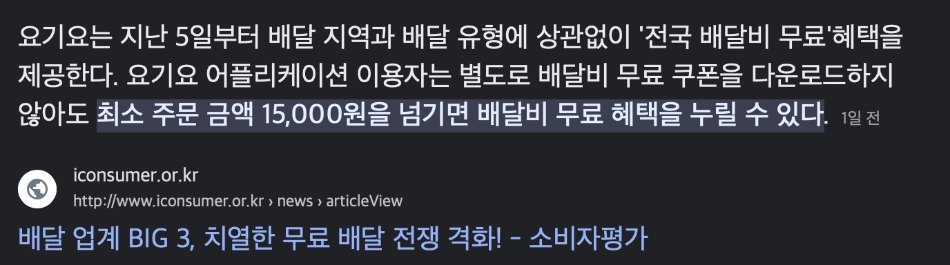 현재 요기요의 경우 최소 주문금액인 15000원을 넘기면 배달비 무료 혜택을 누릴 수 있다고 하는데요.