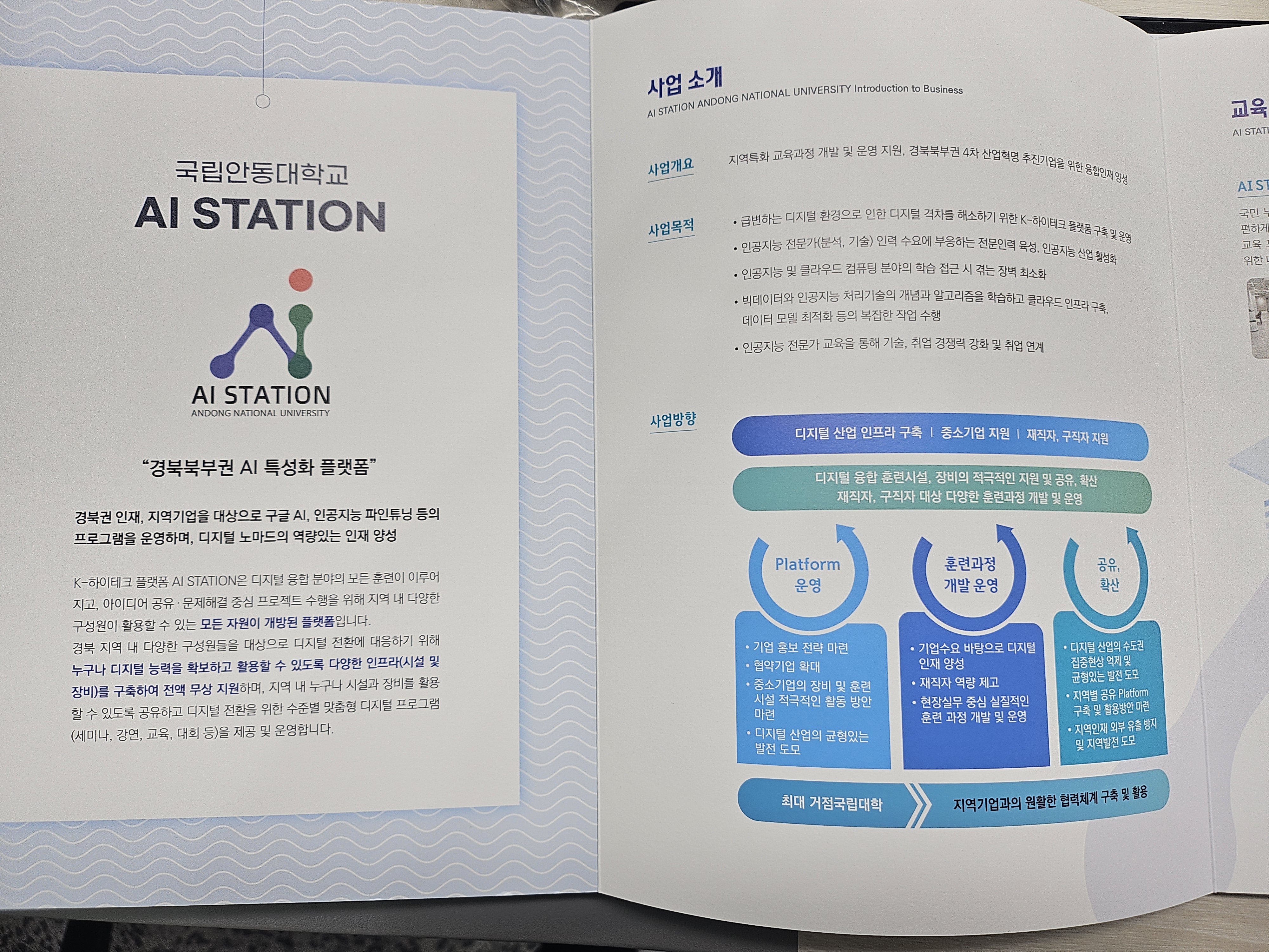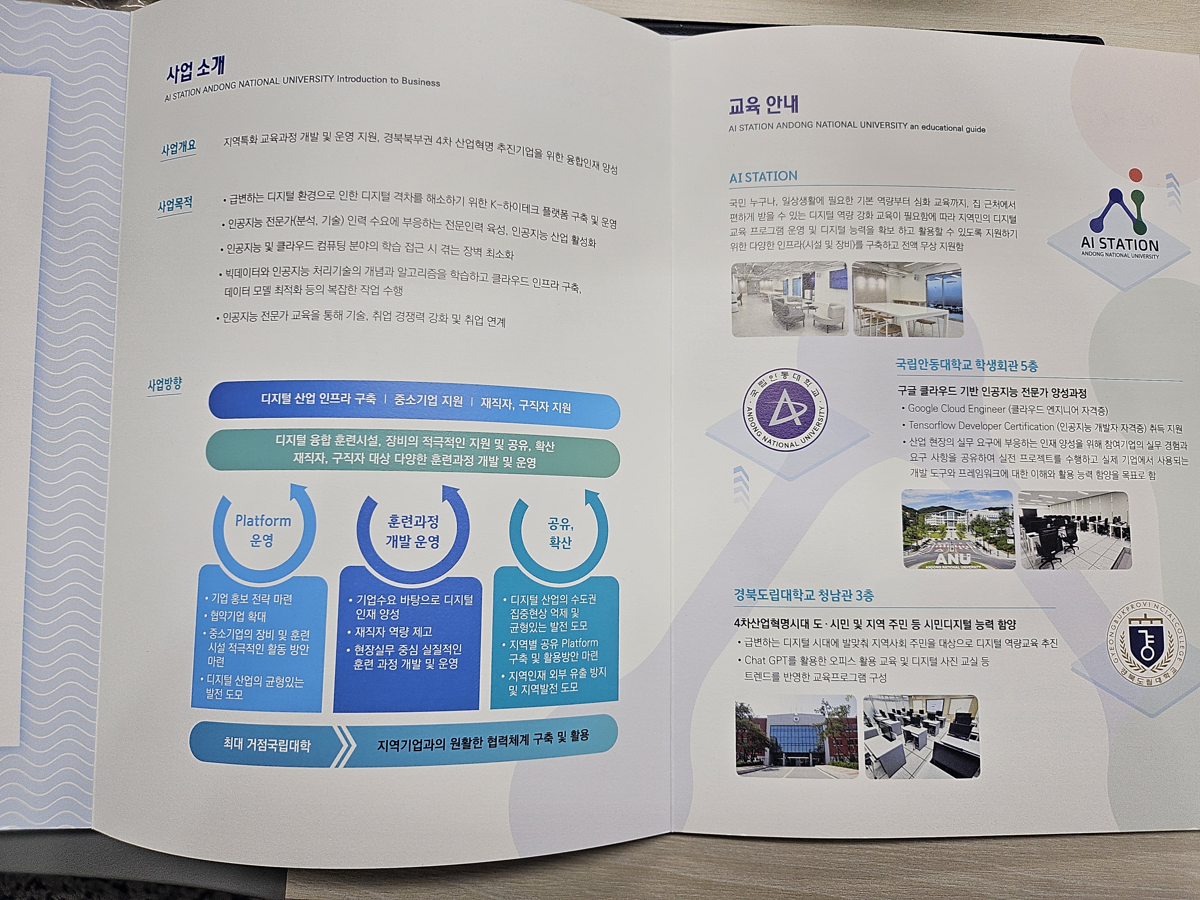 국립안동대학교 K-하이테크플랫폼 AI스테이션에서는 AI 관련된 다양한 시설들이 있는데요. AI룸과 스테이션 룸, 클래스룸인 전산교육실과 컨퍼런스 룸이 있고 이외에도 북스테이션 등 다양하고 최신식 시설을 갖춘 곳이었습니다.
