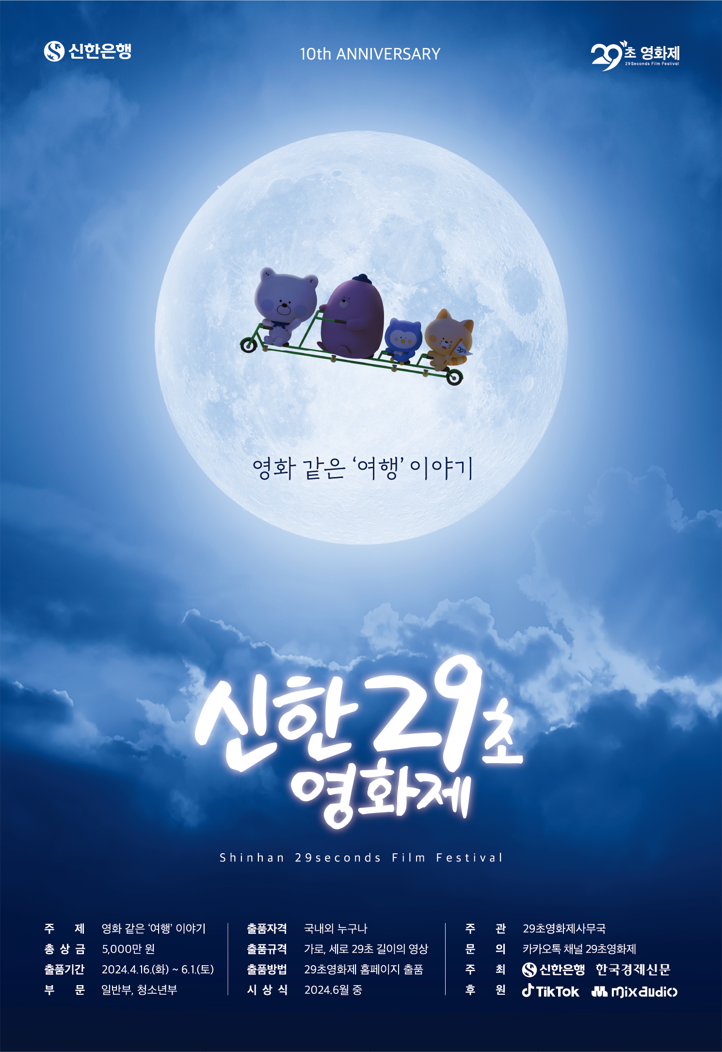 2024년 첫번째 영화제로 "신한 29초 영화제"가 개최됩니다. 신한은행과 한국경제신문이 주최하고 총상금 5,000만원입니다.