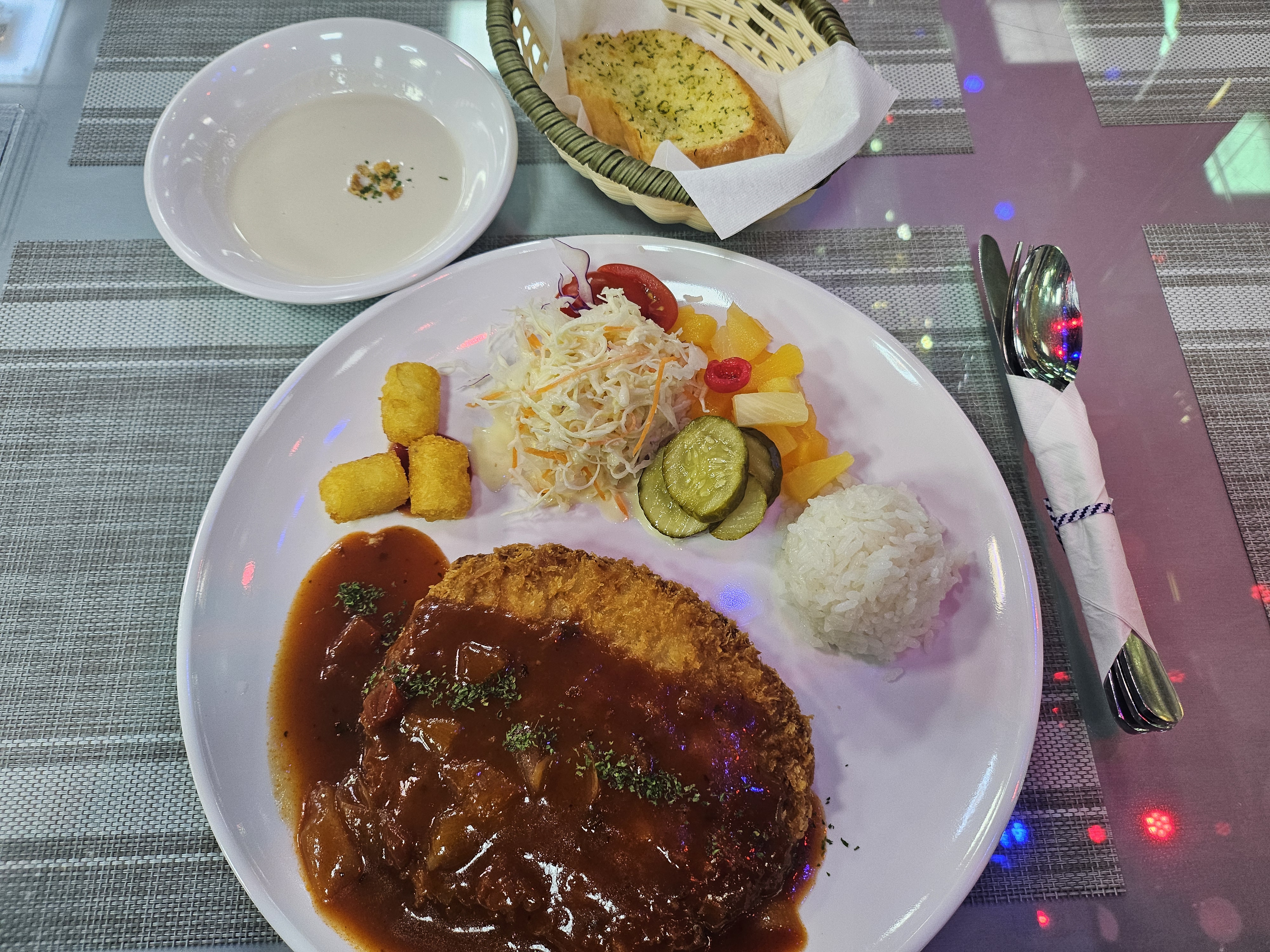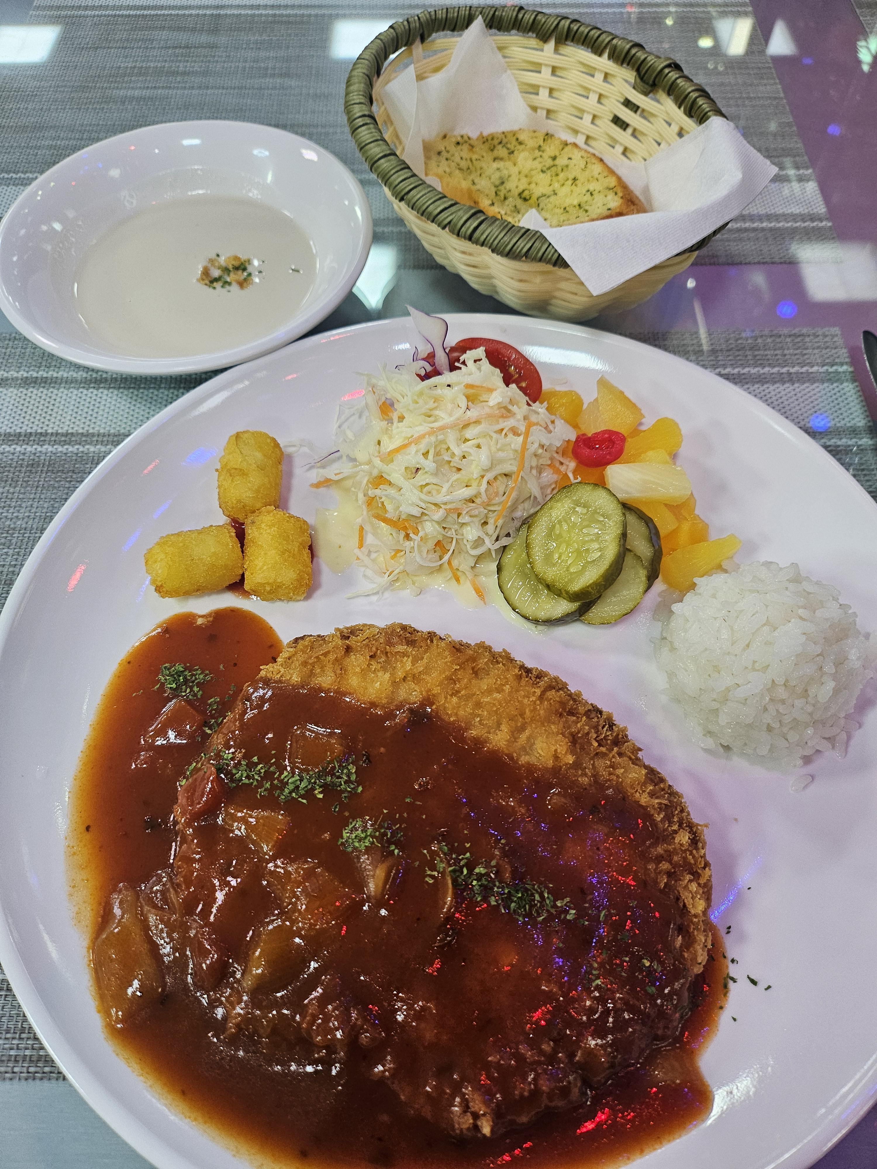 양식 코너에 가서 돈가스 주문하였습니다. 돈가스도 여러가지 메뉴가 있는데 가장 기본인 수제돈가스를 시키면 이렇게 나옵니다. 밥 조금과 감자, 샐러드, 피클, 후르츠 등이 들어가 있는 전형적인 경양식 스타일의 돈가스인데 개인적으로 이런 돈가스를 정말 좋아해서 자주 먹는 편이거든요.