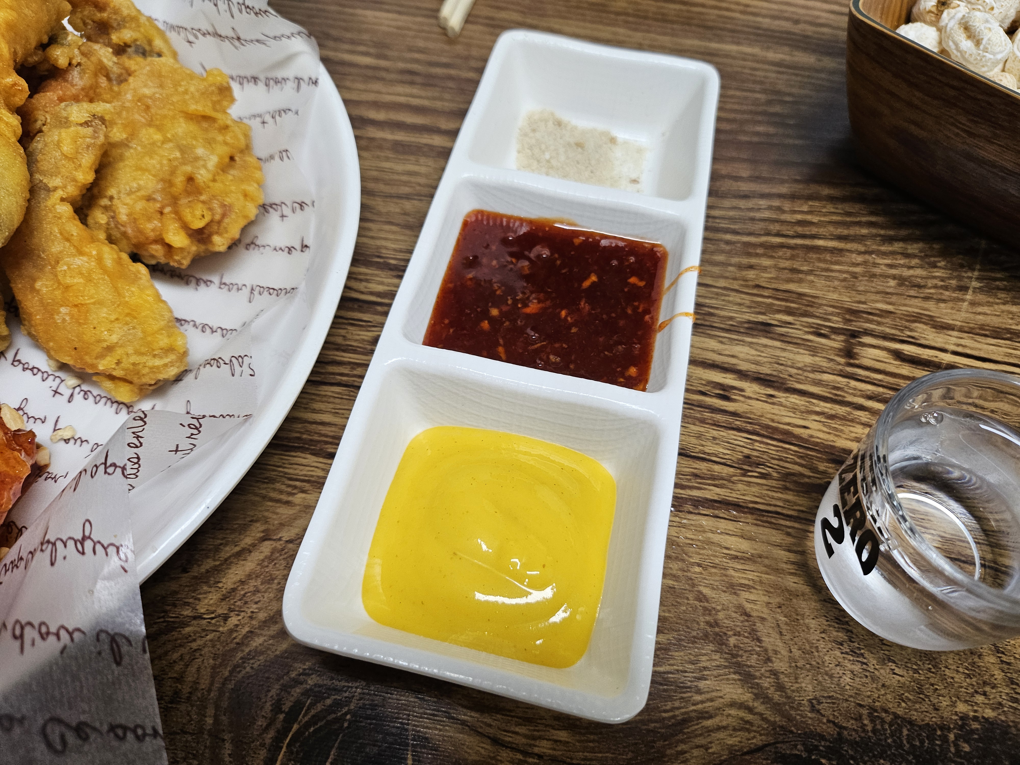 기본 소스 3종 줍니다. 머스타드는 별로 안좋아하고... 양념이랑 소금 종종 찍어먹었었는데요. 기본적으로 간이 어느정도 돼 있어서 그런지 아니면 맛있어서 그런지 모르겠는데 아무튼 소스 없어도 맛있더라구요.ㅎㅎ