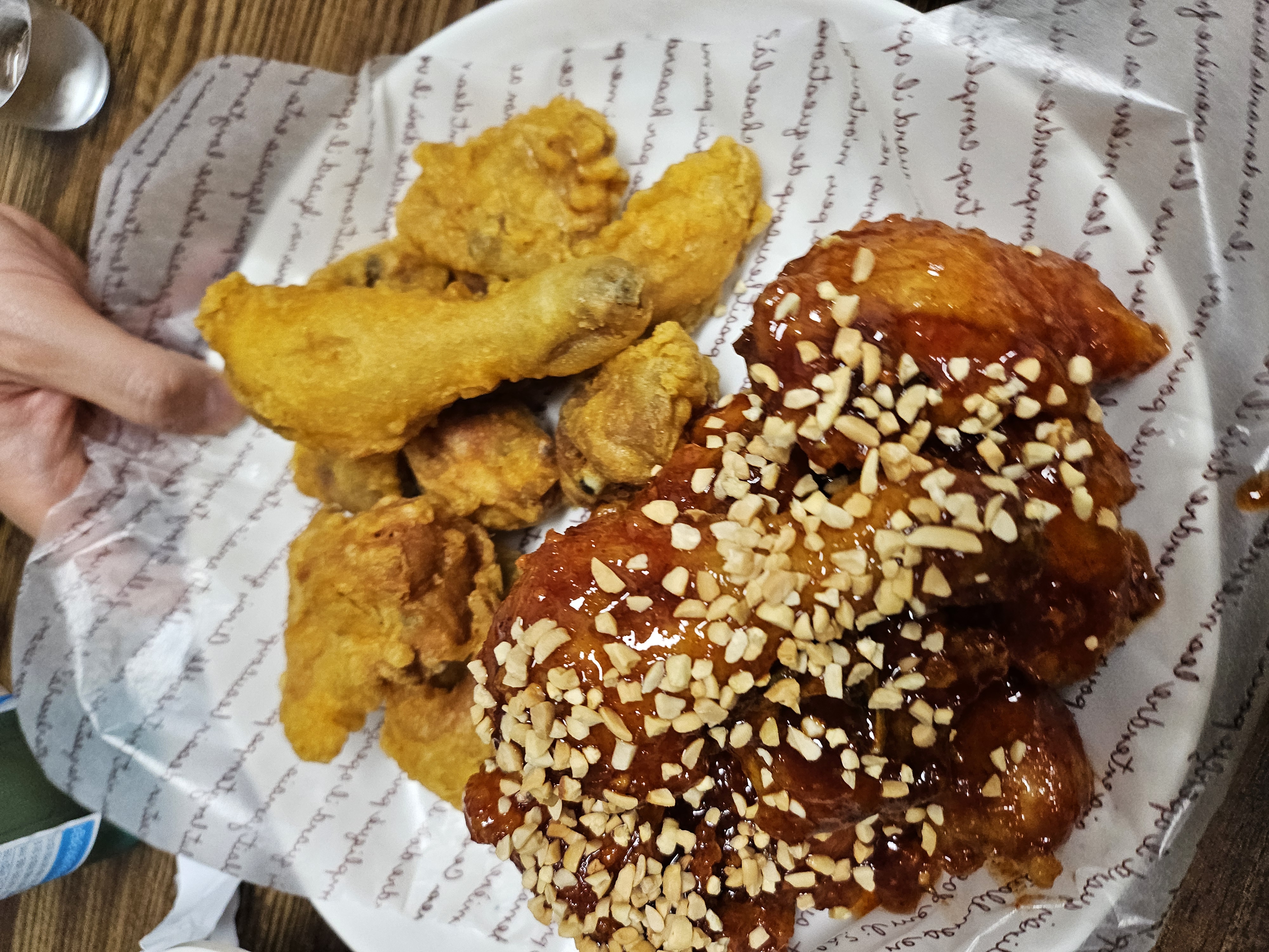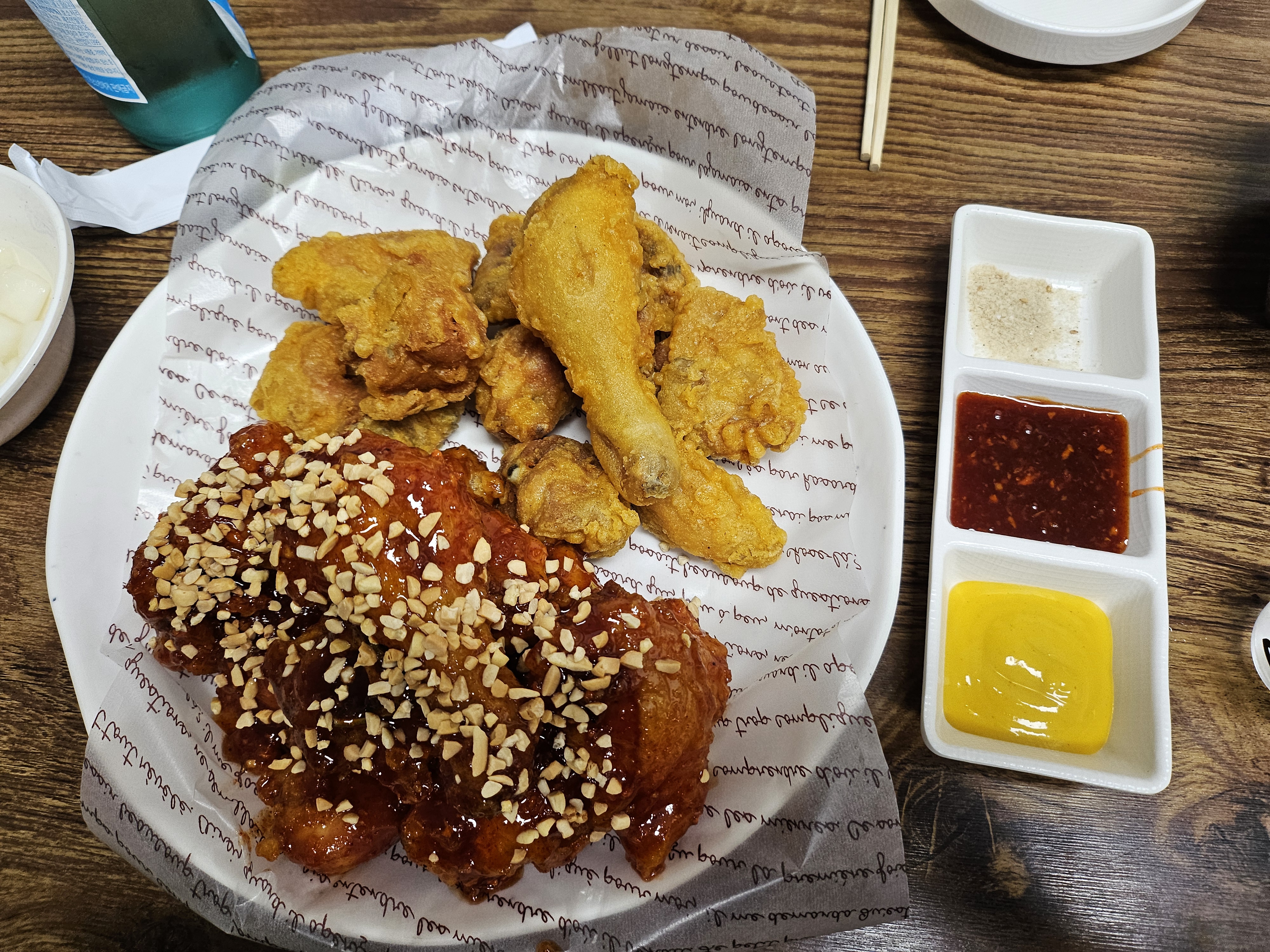 반반치킨. 양도 푸짐하고 무엇보다 맛이 진짜 좋았습니다. 홀에서 먹어서 갓 튀겨서 먹은거라서 그런지 더 맛있었고... 이 날 또 좋았던게 처음 방문할 때 사장님이 기름 처음 넣는다고해서 기름 온도 올라올 때 까지 기다려야했는데, 첫 기름이라 그런지 뭐 더 맛있었어요.