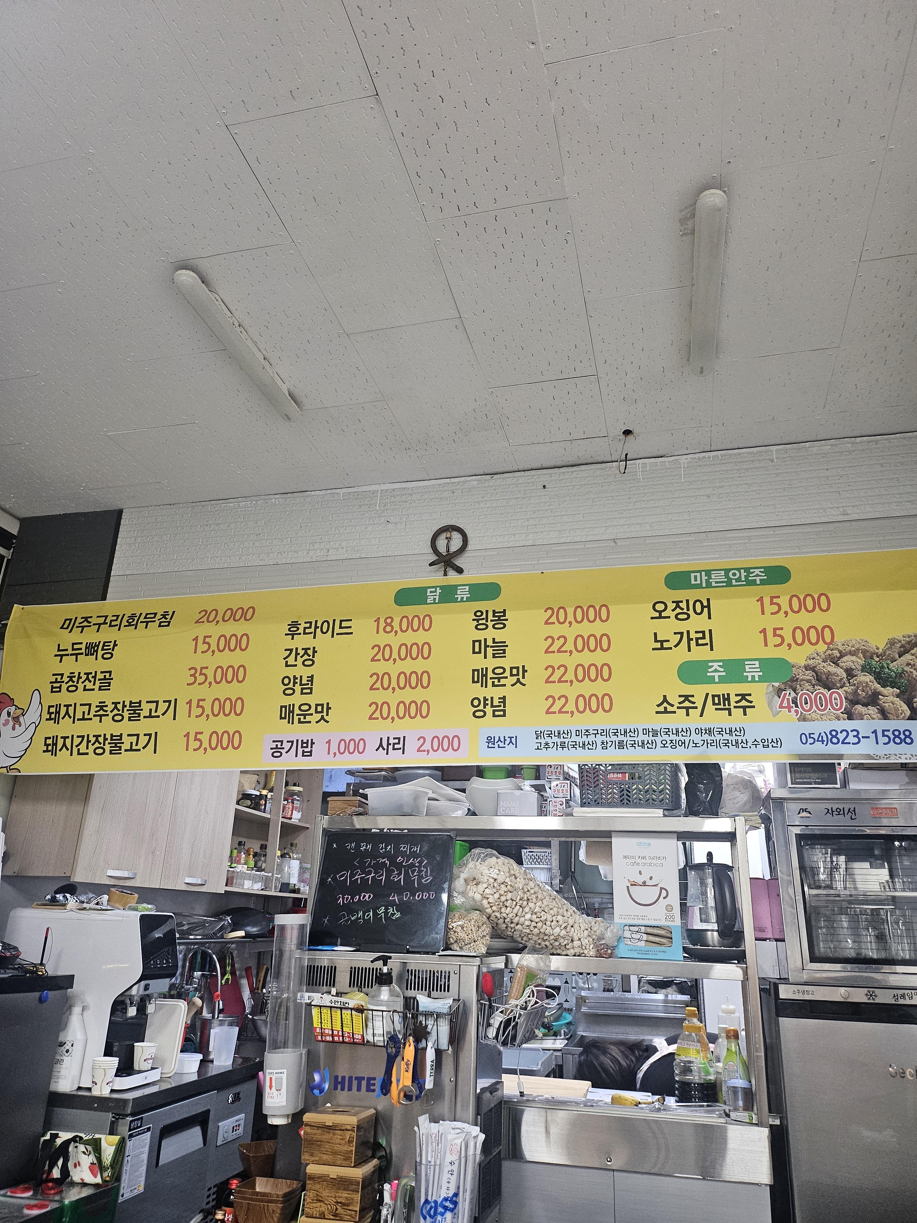 가게는 대충 이런 느낌입니다. 메뉴판은 그래도 찍었네요. ㅎㅎ 미주구리회무침이 메인메뉴인 것 같고, 치킨도 메인 중 하나로 보이는데 메뉴판에는 없지만 사장님께 물어보니 반반도 가능하다고해서 처음 가본 김에 반반으로 주문했습니다. SNS에서는 사람들이 간장치킨이 레전드라고해서 다음에는 간장치킨으로 먹어볼 예정입니다.
