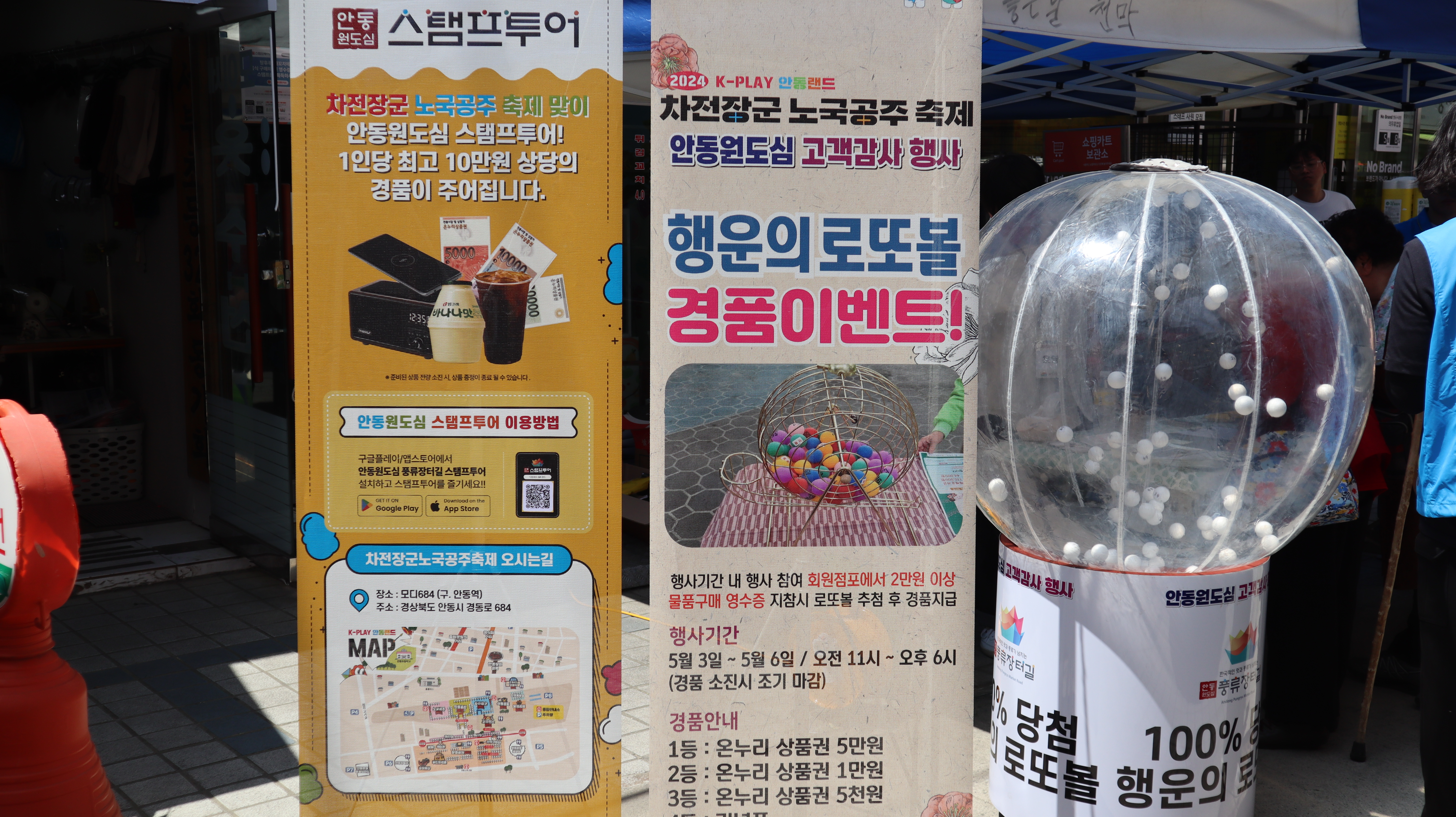 2024 안동 원도심 고객감사 행사 프로그램들 중에서 스탬프 투어를 통한 100% 당첨 행운의 로또볼 이벤트 현장도 방문해보았습니다. 고객들이 진짜 많아서 줄서서 행운의 로또볼을 체험하고 계시더라고요! 안동 원도심 회원 점포에서 2만원 이상 물품 구매 영수증을 지참하면 이벤트에 참여할 수 있는 체험이었는데요. 가족단위로 함께하는분들이 많았습니다.