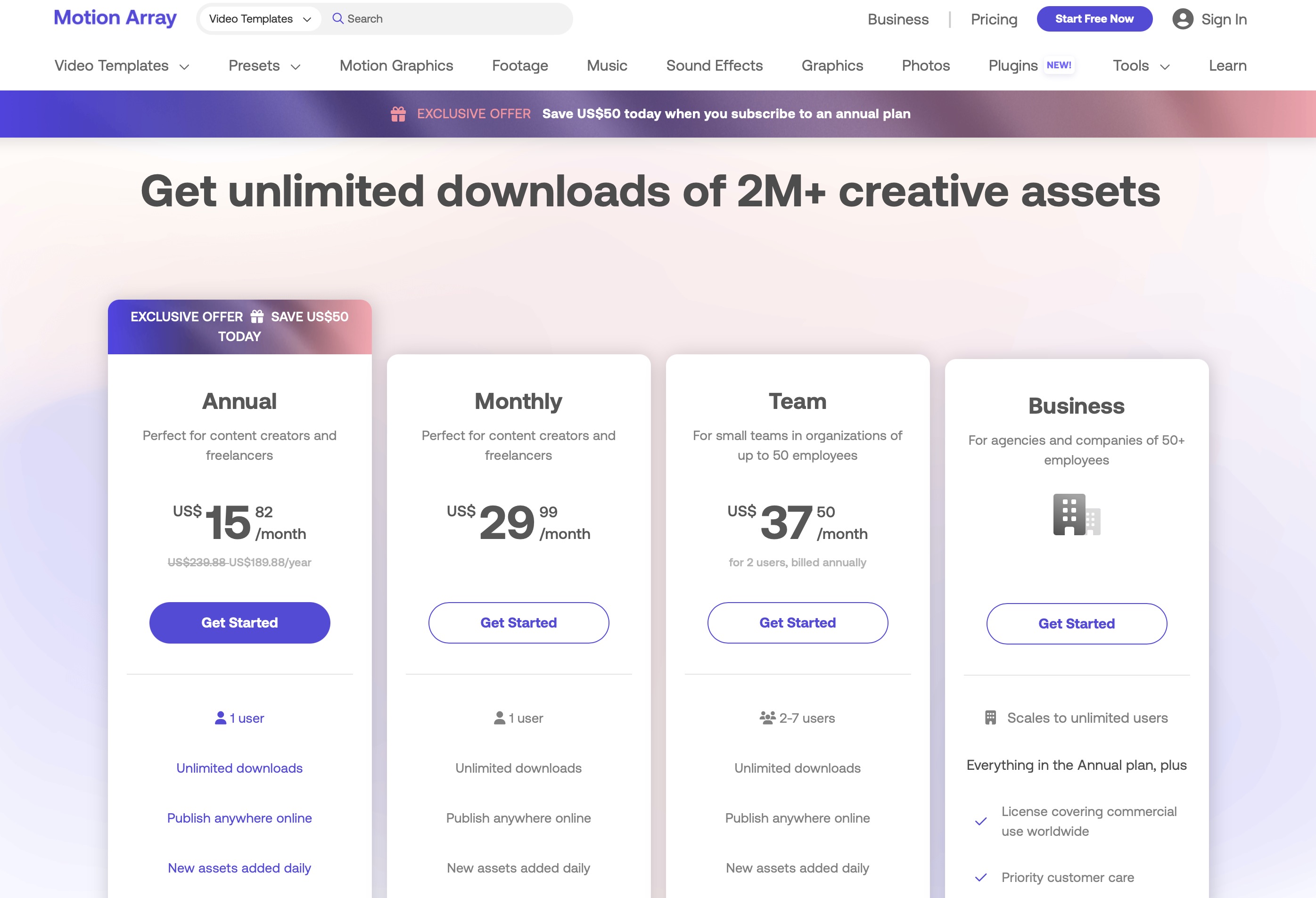모션 어레이는 다양한 구독 계획을 제공합니다. 한 달에 $29.99에 월간 멤버십에 가입하거나 연간 $239.88(또는 월 $19.99)에 연간 멤버십을 선택할 수 있습니다. 연간 구독은 100달러 이상을 절약할 수 있으며, 이는 꽤 큰 금액이라고 할 수 있습니다.