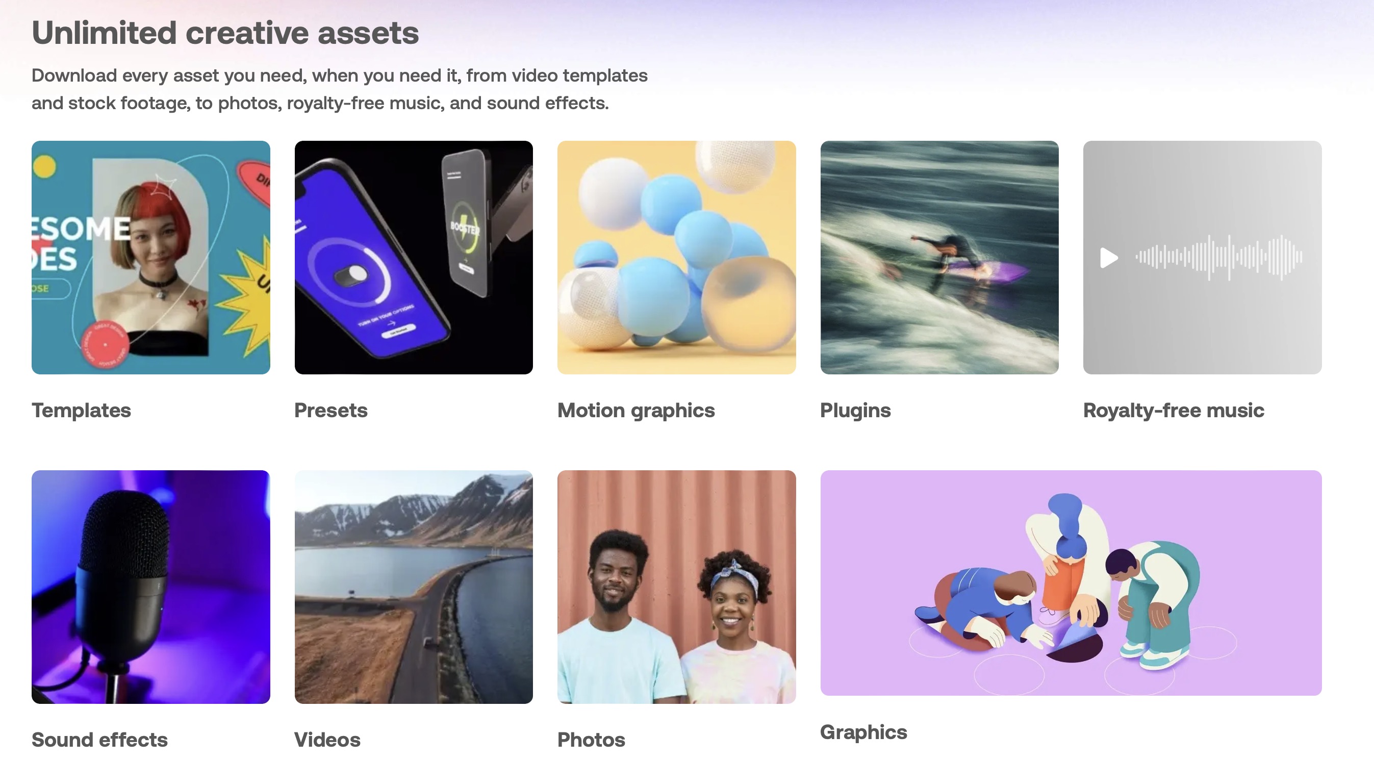 Create your projects with unlimited asset downloads: premium Templates, Presets, Stock Photos, video elements and a website builder - all in one membership!