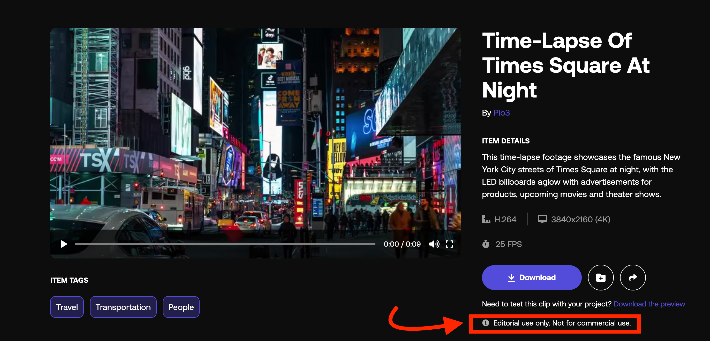 여기에서 한가지 주의사항은, 모션어레이에 있는 자산들 중 "편집 전용"으로 표시된 비디오와 이미지가 있는데요. 이 콘텐츠들은 상업적 사용(영화, 광고 및 기타 유료 미디어)으로 이용할 수 없다는것만 주의하시면 되겠습니다. 여기에 해당하는 자산은 그렇게까지 많지는 않아서 꽤 자유롭게 모션어레이를 이용할 수 있습니다.