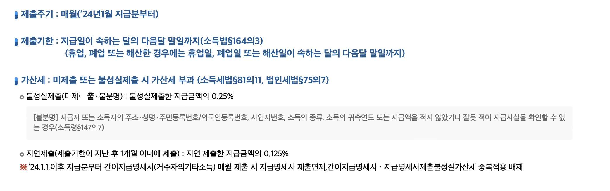 2024년부터는 간이지급명세서를 매월 제출해야하며 만약 간이지급명세서를 매월 제출할 경우 지급명세서 제출은 면제해준다고 합니다. 더불어서 매월 제출할 경우 제출 불성실 가산세 중복적용에서도 배제해준다고 하네요. 하지만 매월 제출하지 않을 경우, 불성실제출 시 가산세가 부과되니 주의해야합니다. 0.25%입니다. 지연 제출만 해도 0.125%가 붙습니다.