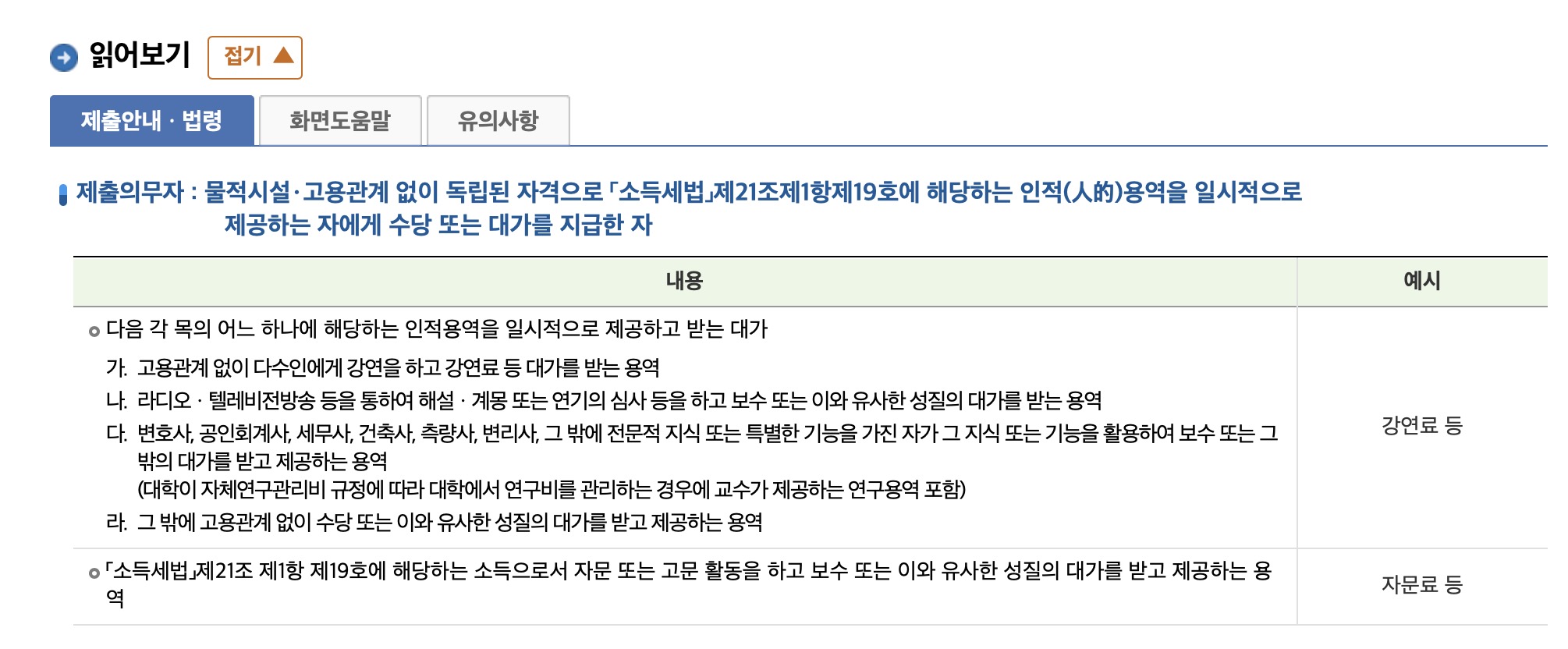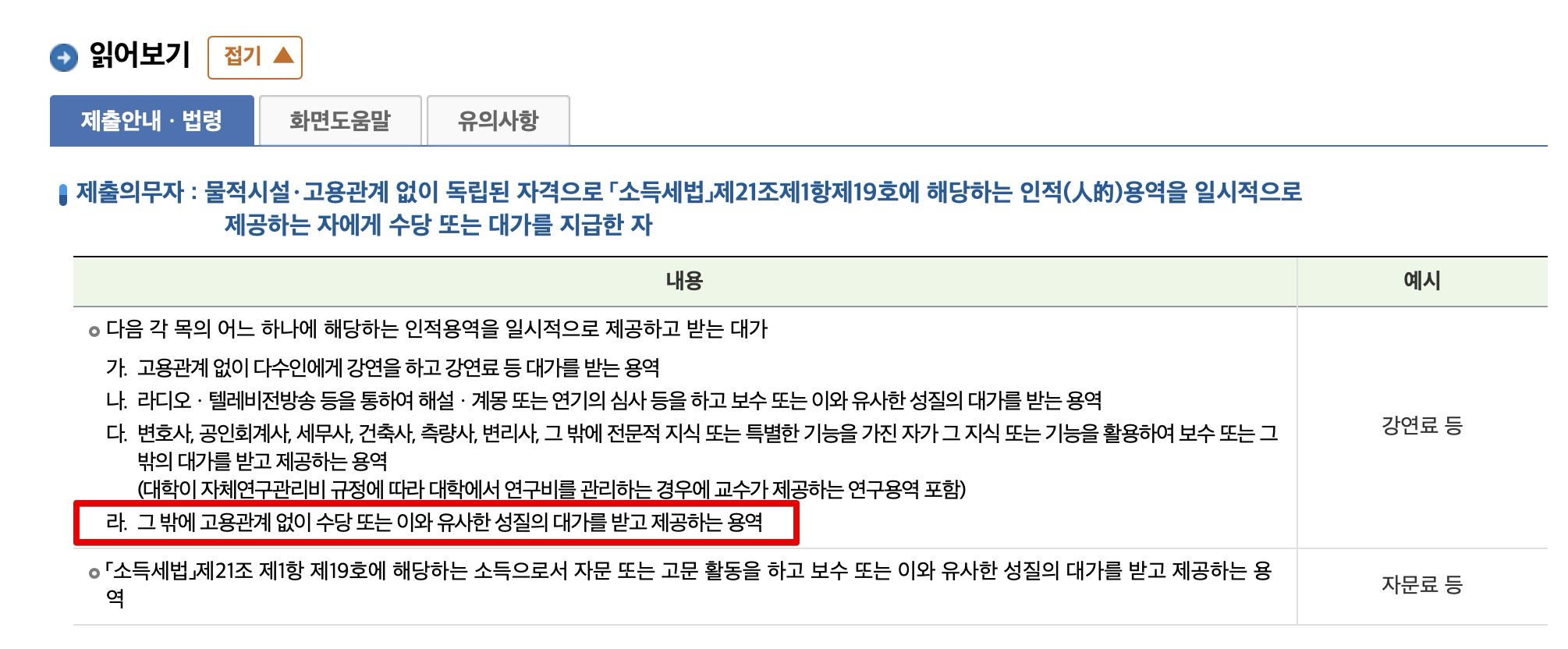 신청 화면 아래쪽에 있는 읽어보기 내용에서도 '라'번 항목이 그나마 일반적인 기타소득을 지급하는 환경인 것 같아서 강연료 쪽에 넣으면 적절해보였습니다.