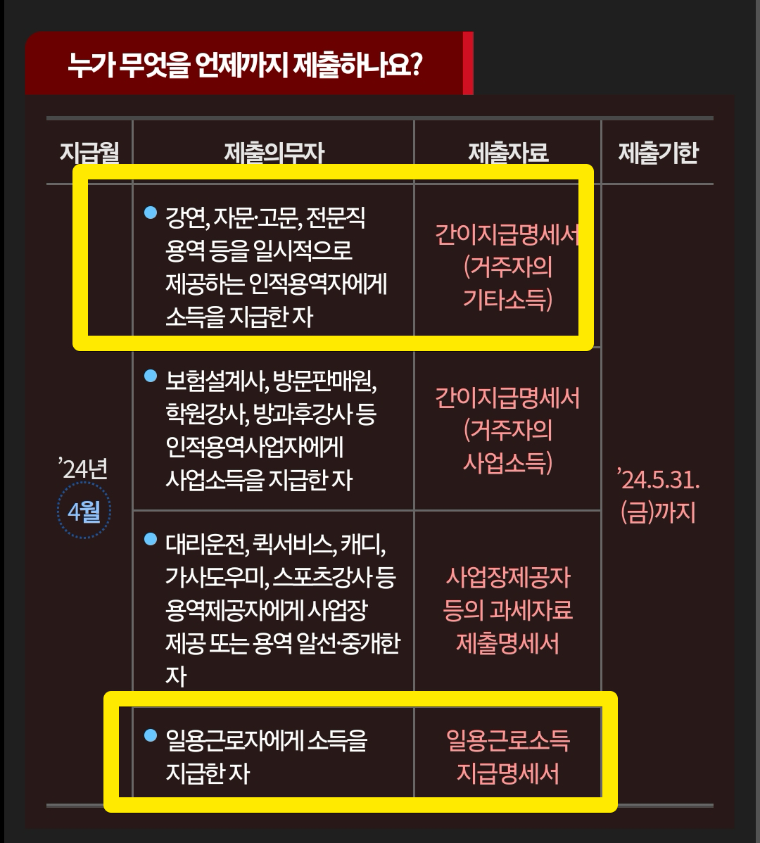 제출기한이 지급일이 속하는 달의 다음달 말일까지입니다. 그러니까 만약 2024년 5월에 용역을 통해 기타소득을 지급하였다면, 2024년 6월말까지 지급명세를 제출해야합니다.