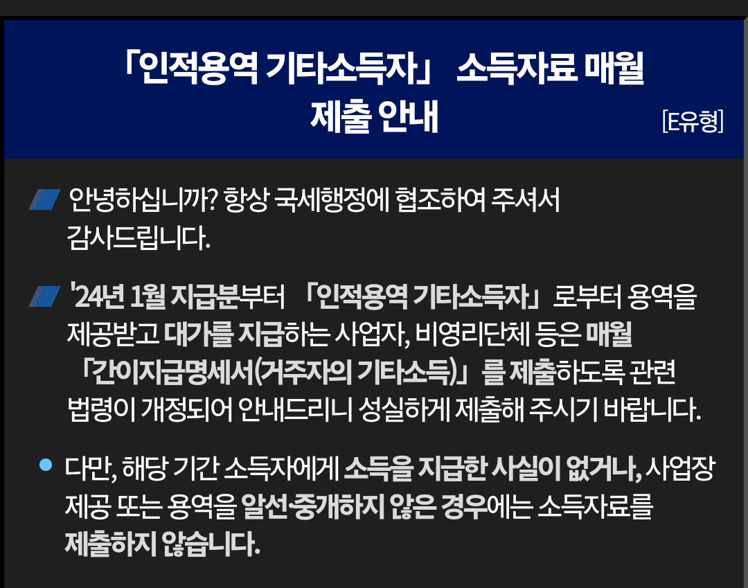 2024년 1월부터는 인적용역 기타소득자로부터 용역을 제공받고 대가를 지급하는 사업자와 비영리단체는 매월 간이지급명세서를 제출해야합니다. 원래는 이걸 한꺼번에 모아두었다가 다음해 2월에 한꺼번에 총합으로 신고하거나 아니면 8월 이후에 매월 신고하는 기간에 제출했었던걸로 알고 있습니다. 그런데 2024년부터는 매월 신고하는걸로 바뀌어서 이제 간이지급명세서의 경우 매월 신고를 해주어야하는 상황입니다.
